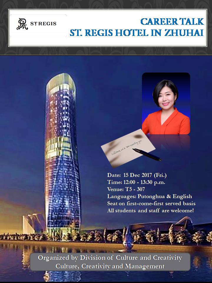 诚邀您参加珠海瑞吉酒店的职业讲座, 分享嘉宾为该酒店的人力资源总监韩晶晶女士。 本次的职业讲座是由文化创意学部 - 文化创意与管理学部主办 , 在此诚挚地欢迎各位老师和同学们前来参加。
