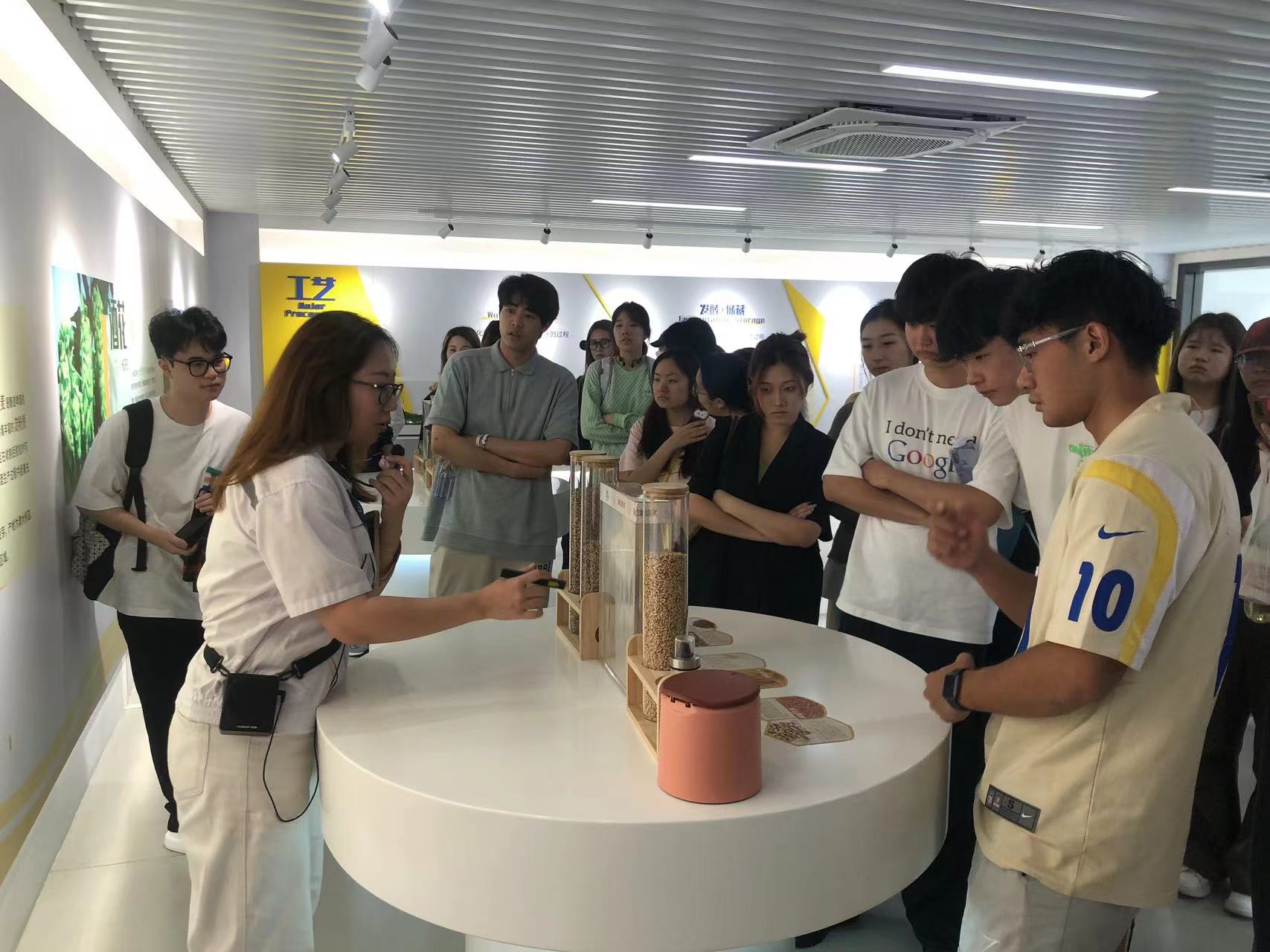 第二个环节,讲解员接着向学生们介绍了一瓶啤酒的诞生过程,从初期原料的甄选、处理和加工到后期冷却、发酵和过滤,再到最后的包装、运送和销售。要经历“九九八十一”道工序,每一个步骤对于产品质量的把控都是十分的关键。在科普过程中,学生们有幸体验了啤酒花的气味,更是品尝了新鲜的啤酒原料-麦芽。