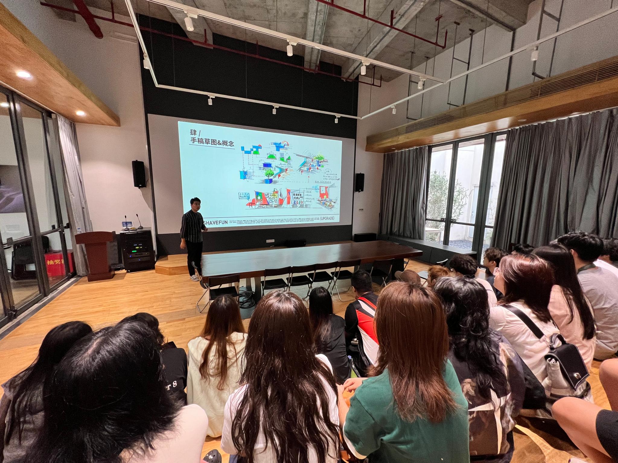 同学们首先聆听了艾德设计学院校长陈志超对乐士文化区新的品牌升级计划,方案具体涉及到了文化街区视觉升级的规划、布局和营造的文化氛围等方面问题及相关可行性建议。同学们学到了如何从需求出发而更精准地提出自己的创意方案。