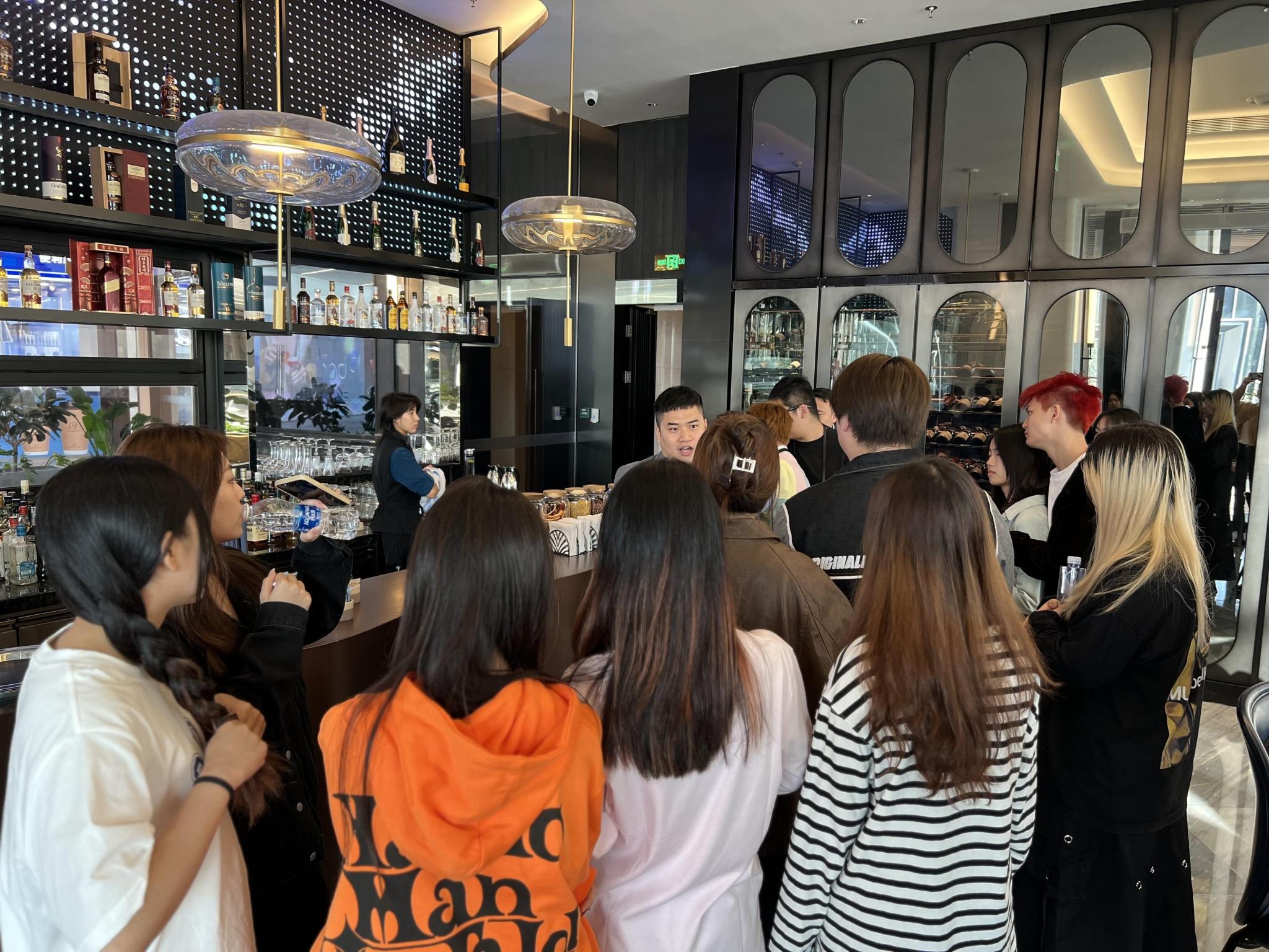 中海万丽酒店特色酒吧-R吧的负责人在为学生讲解相关内容