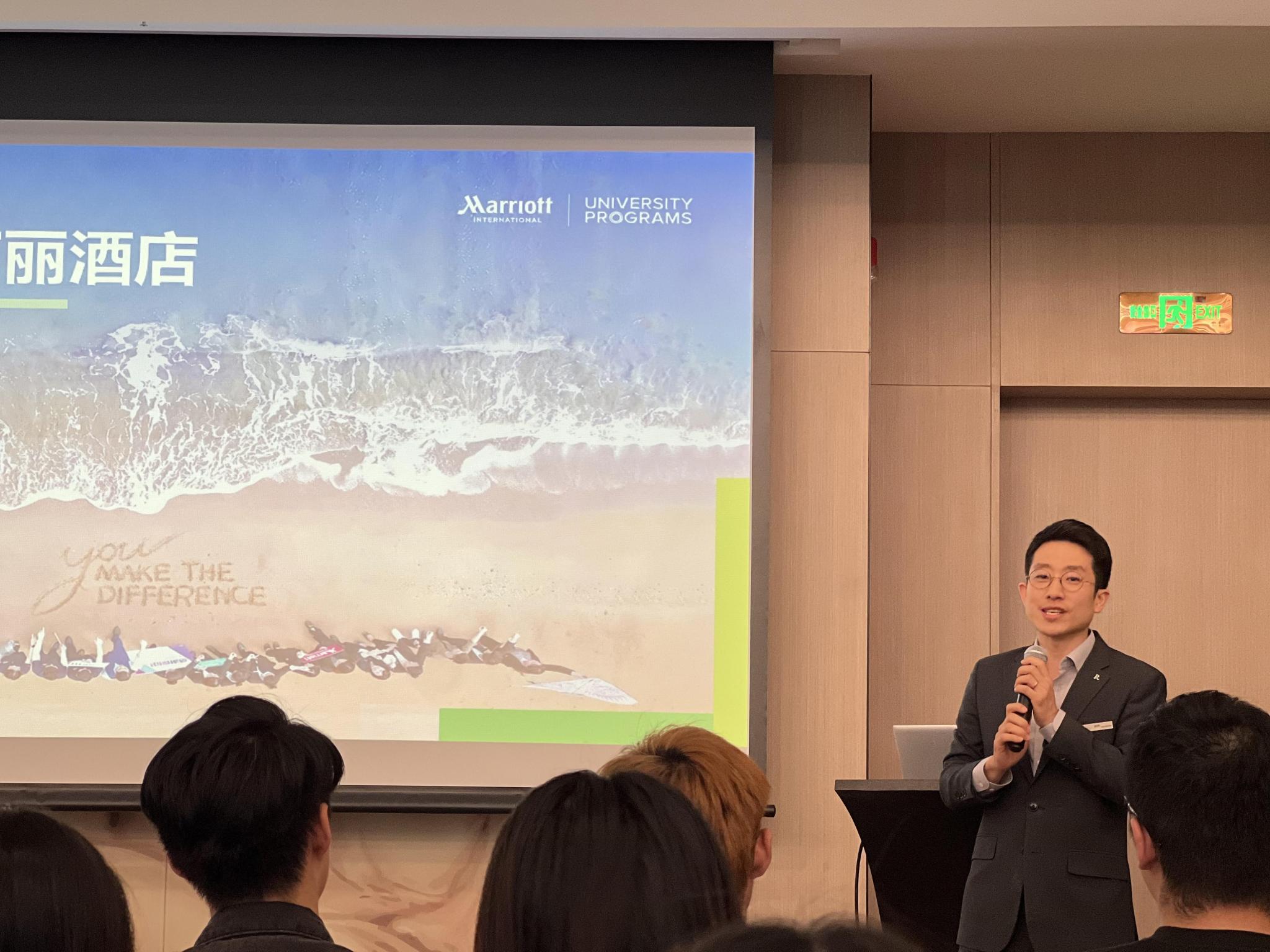 中海万丽酒店的总经理赵时炯先生在台上与学生交流互动