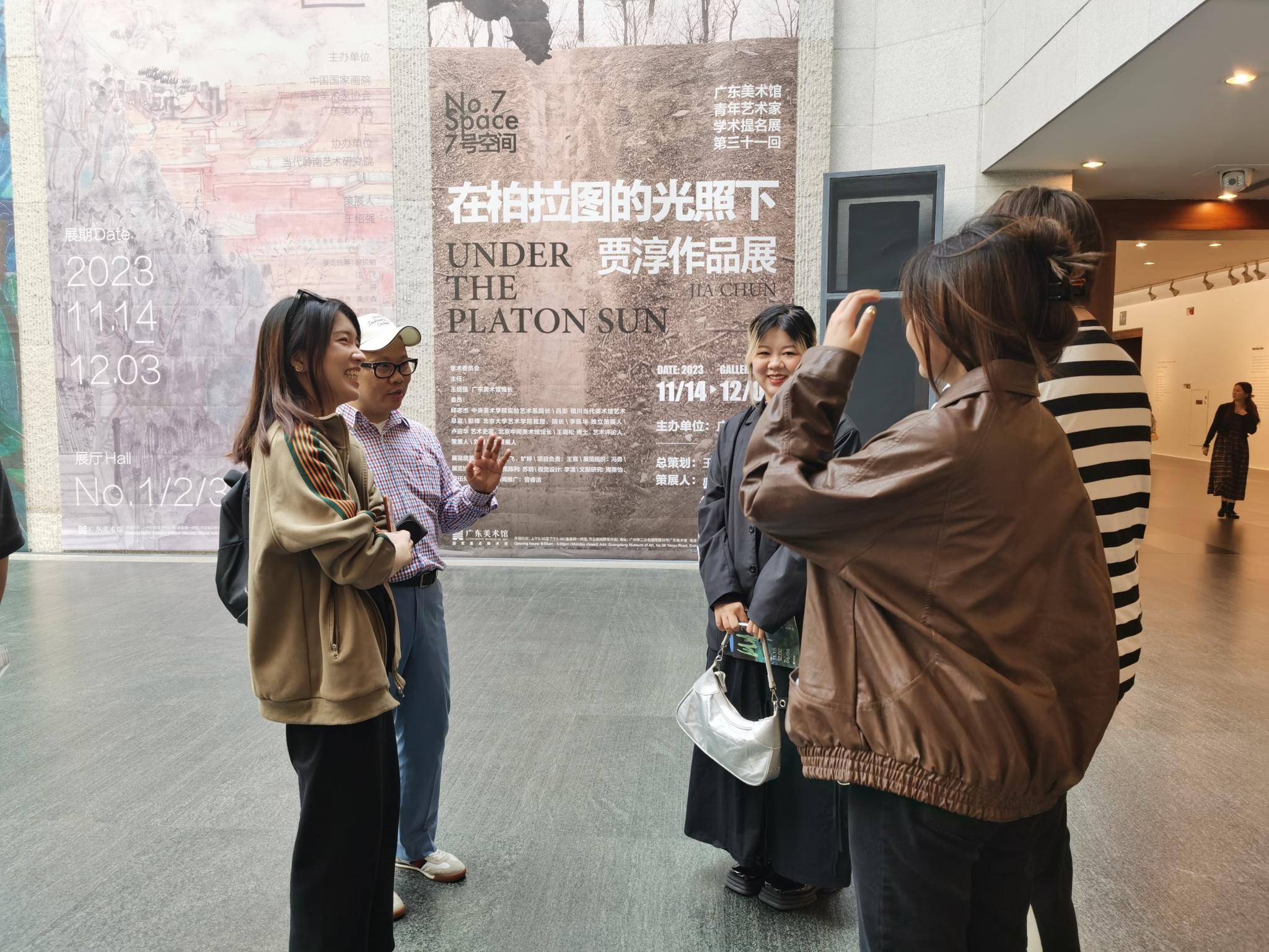 在广东美术馆工作人员黄海蓉女士的介绍和导览下,同学们开始了艺术鉴赏之旅。展览展出了许多艺术家的作品,如“山川·重构-林顺文作品展”、“熟知非真知-日常视野中的观看”、“空间·无界-秦立运舞台设计作品展”、“7号空间-在柏拉图的光照下-贾淳作品展”等。