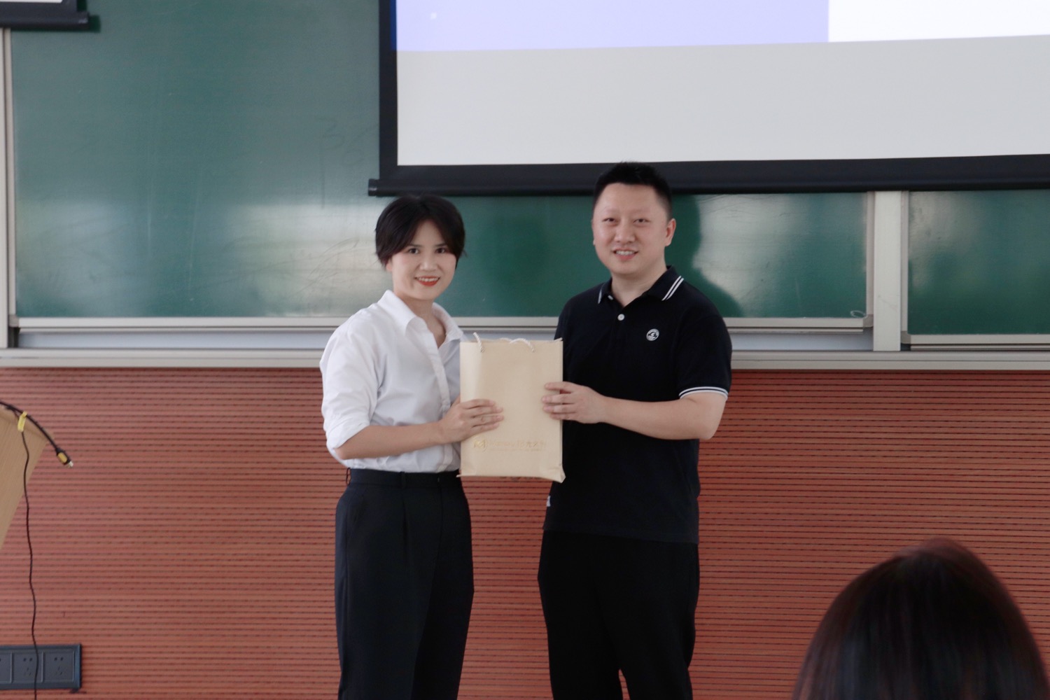 李莎女士和王兮教授合影,并赠送学校纪念品表示感谢