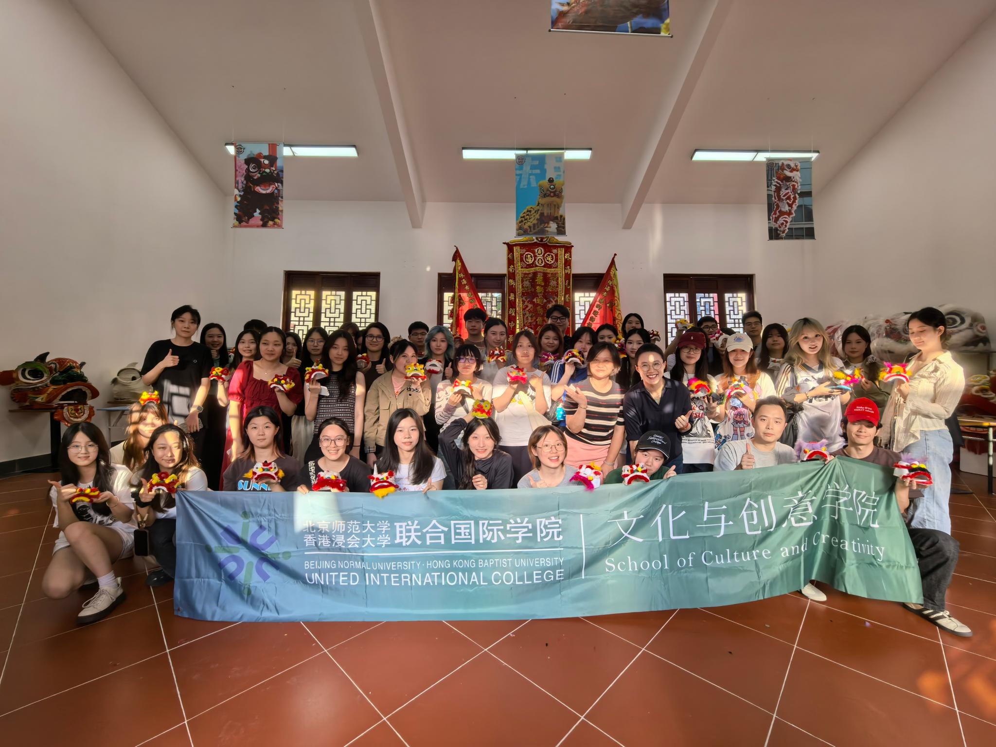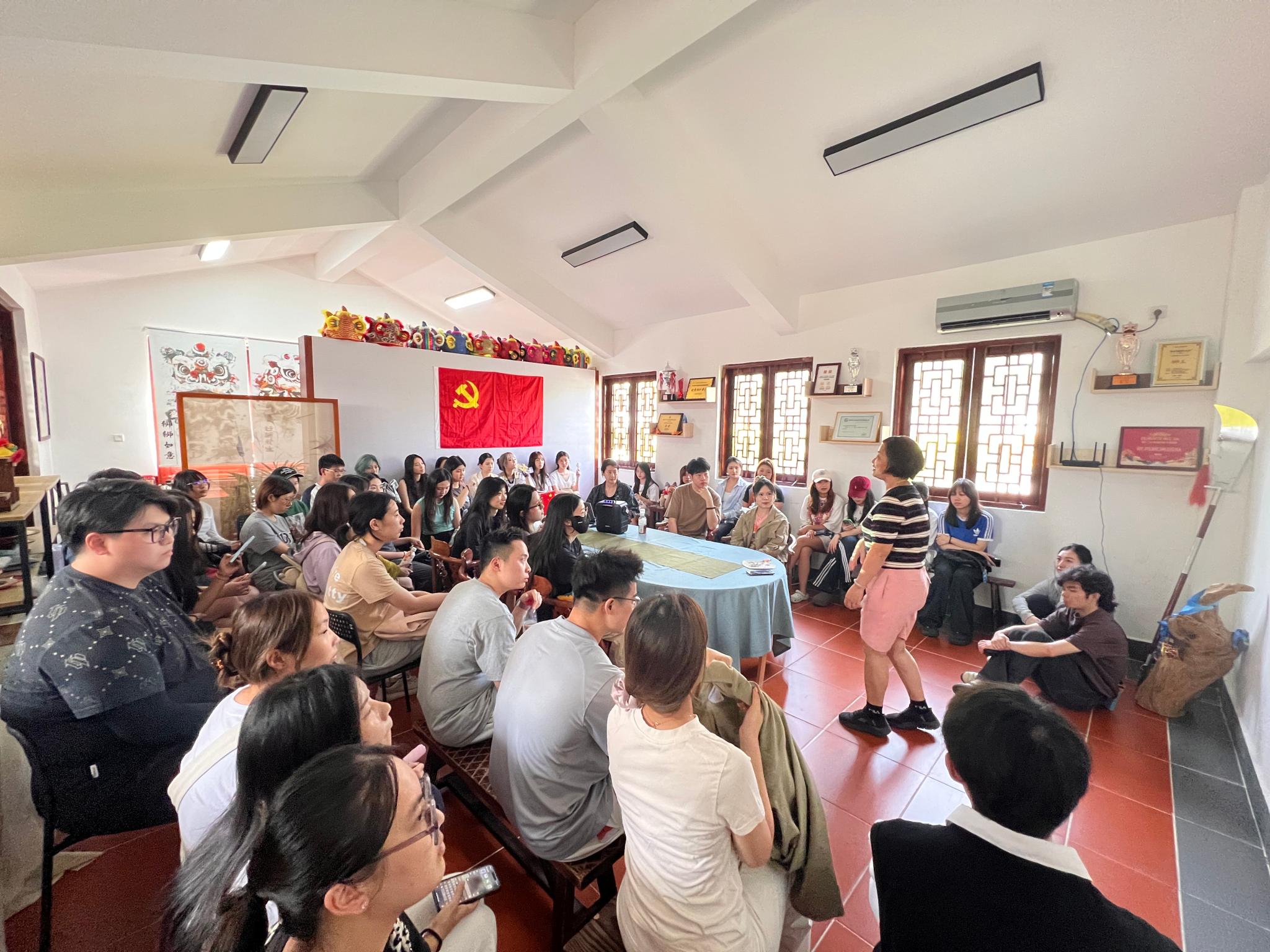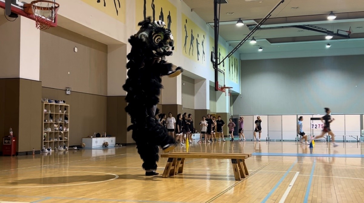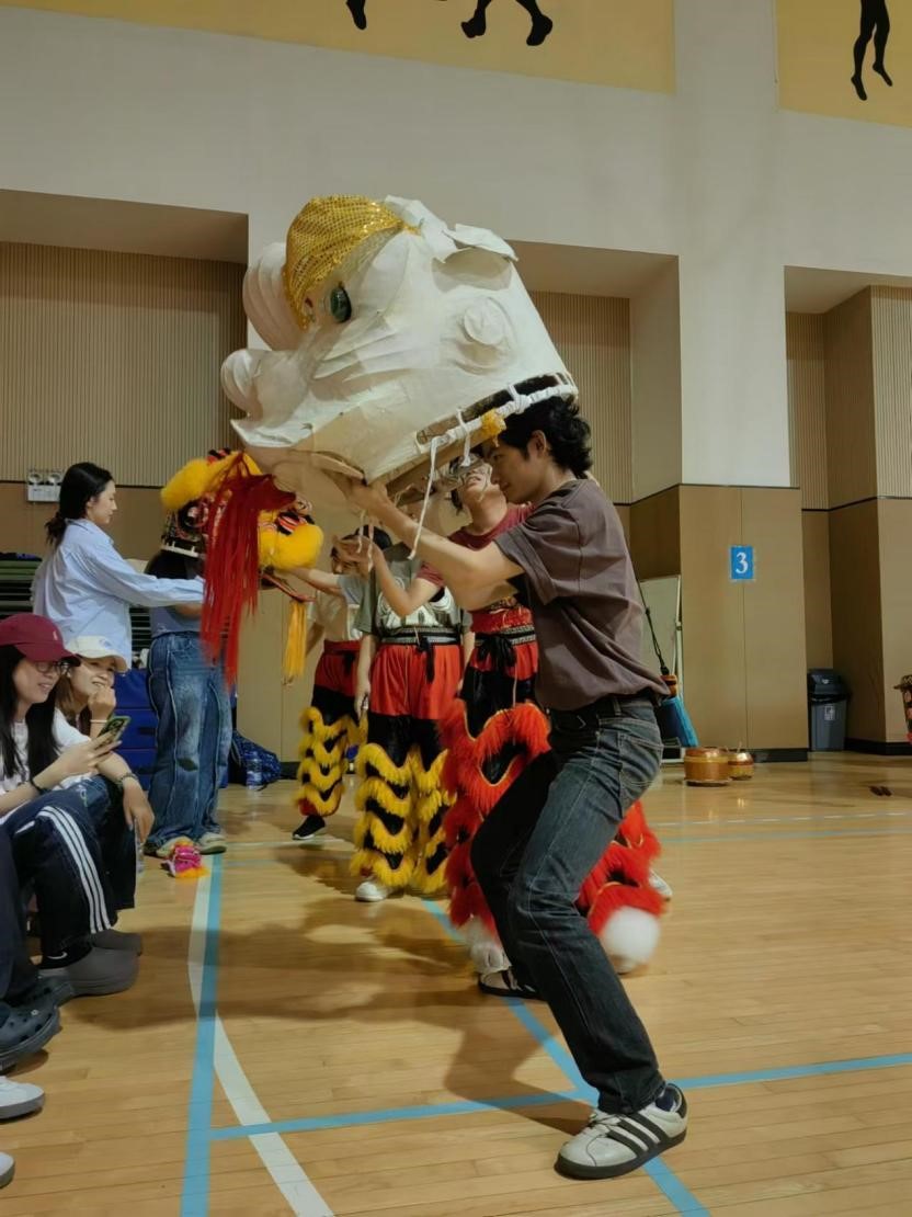 官塘考察行程结束后,万老师还特别安排同学们观看了UIC醒狮队的醒狮表演——张飞醉酒,并沉浸式体验了醒狮的基本动作要领。