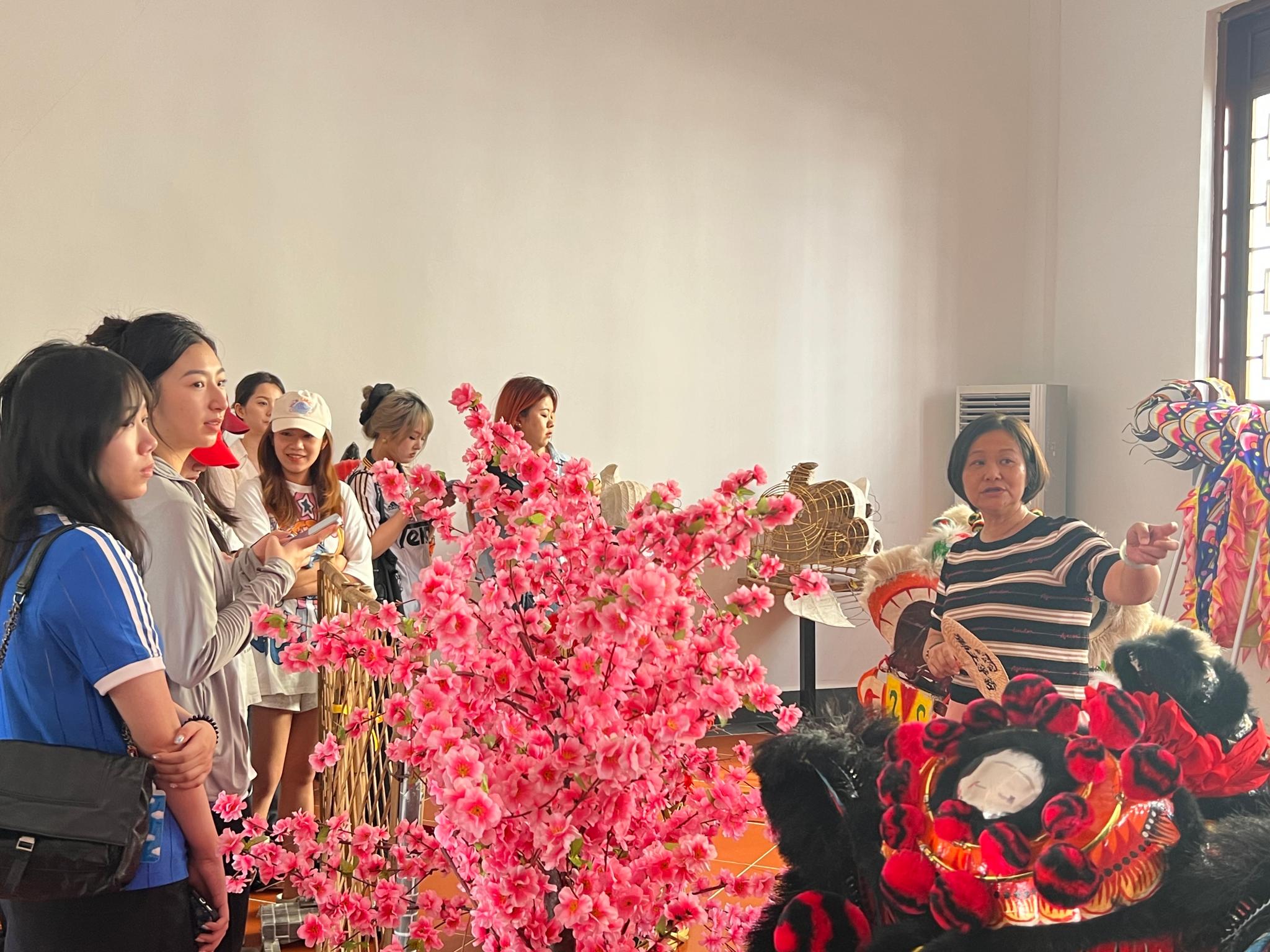 为了让同学们更深入了解一个非遗文化,并把创新传承作为一种使命,万老师除了邀请邓先生亲临教室向同学们进行醒狮文化的细致讲解外,还带领学生来到了坐落于官塘村非遗龙狮文创馆实地考察和交流,旨在通过非遗的传承联动乡村旅游发展。期间,珠海市舞龙舞狮运动协会会长卓奕君女士在现场为大家介绍并展示了各个狮头的代表的角色、队旗的意义、珠海龙狮协会在传承上作出的努力及所面临的困难,让学生真真切切近距离感受到醒狮的魅力和传承的责任。