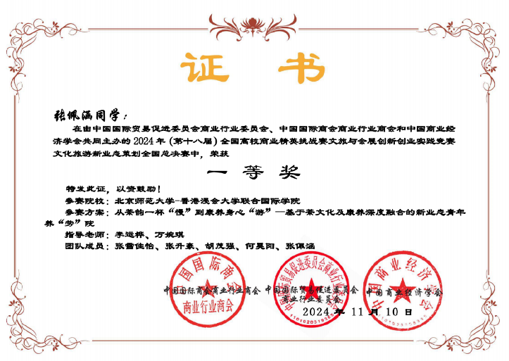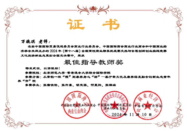 在刚刚落下帷幕的 2024 年第十八届全国高校商业精英挑战赛文旅与会展创新创业竞赛全国总决赛暨(新加坡)国际商务会展策划大赛中国地区选拔赛上,由CCM师生与其他院系师生联合组成的队伍通过初赛(含知识赛)、复赛(广东省赛)、全国总决赛等多个环节的激烈比拼,最终脱颖而出获得全国总决赛第一名,其中包括来自22 CCM(文化创意与管理)专业张佩涵同学。同时,万婉琪老师获最佳指导教师奖!