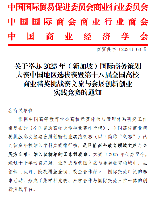 全国高校商业精英挑战赛文旅与会展创新创业实践竞赛已连续多年被纳入全国普通高校大学生竞赛排行榜,是目前商科教育领域文旅与会展方向唯一纳入该榜单的国家级赛事。经过十八年的发展,现已成为我国文旅与会展教育领域规模最大、参与院校最多、产教融合深入、国际对接广泛的综合实践平台和学科竞赛活动。