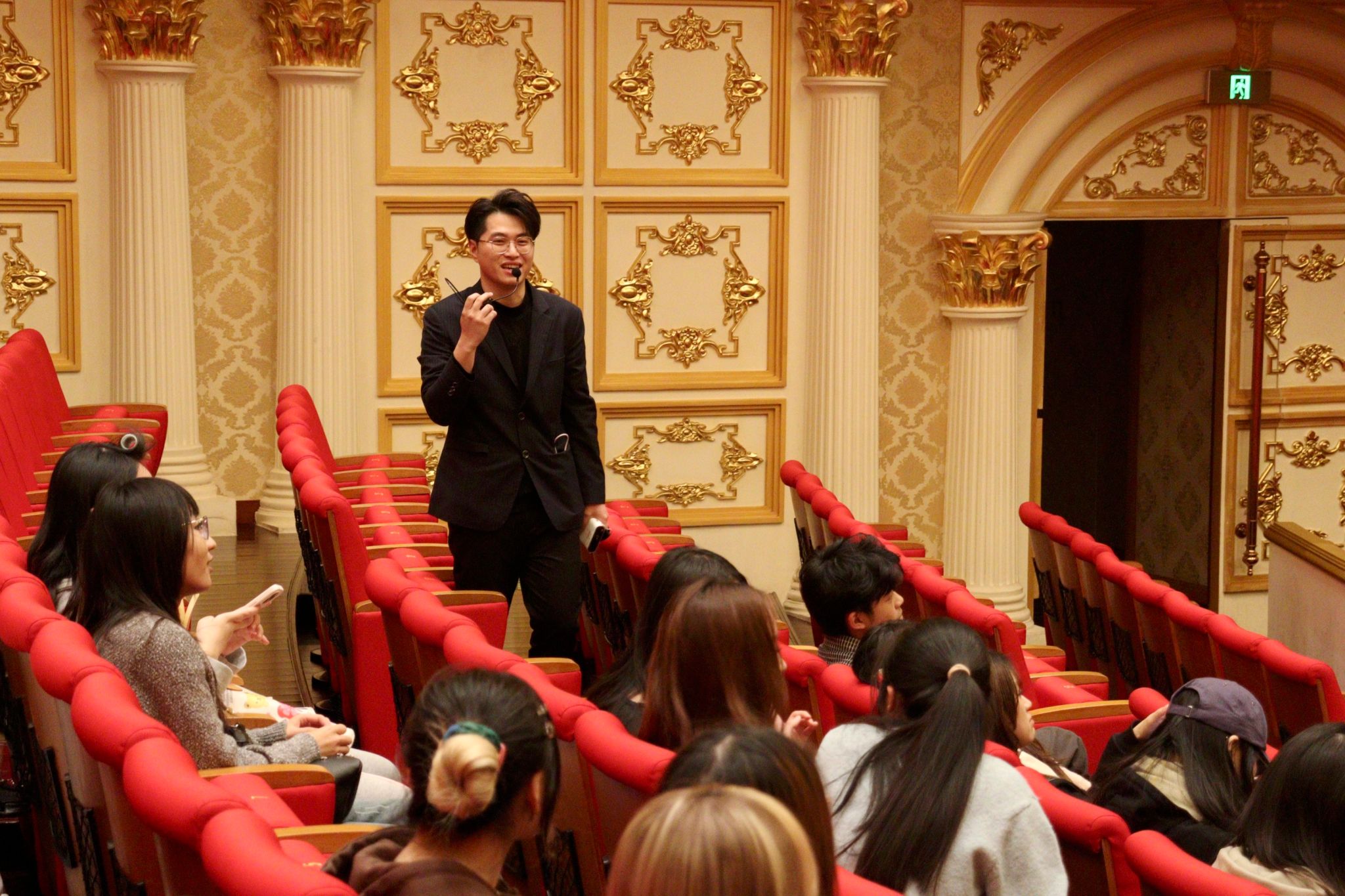 此外,学生们还参观了莫扎特音乐厅。这由奥地利莫扎特基金会支持,因此以莫扎特命名。在室内装修上,其借鉴了维也纳的金色大厅,穹顶镶嵌金箔浮雕装饰,中间放置管风琴,整体金碧辉煌。通过独特的声学设计,使每个位置的观众听到声音的速度完全相同。学生们亲自走上舞台和入座观众席,分别感受作为艺术表演者和观众的不同体验。