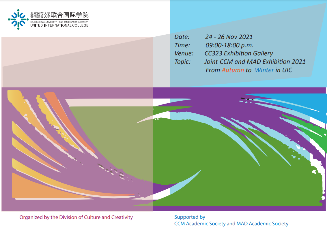 Background: Autumn usually starts the beginning of the school semester whereas Winter marks the end of the semester. As "Season comes, Season goes", the CCM and MAD students would like to share their work during their college lives in UIC. During this season, there are many festivals in the world celebrate the "Harvest" time with encouragement and thanksgiving heart. Although students and staff are very busy in UIC with all the ongoing academic activities and study; however, through the exhibition during this special season, this is time "To give, to serve and to receive".