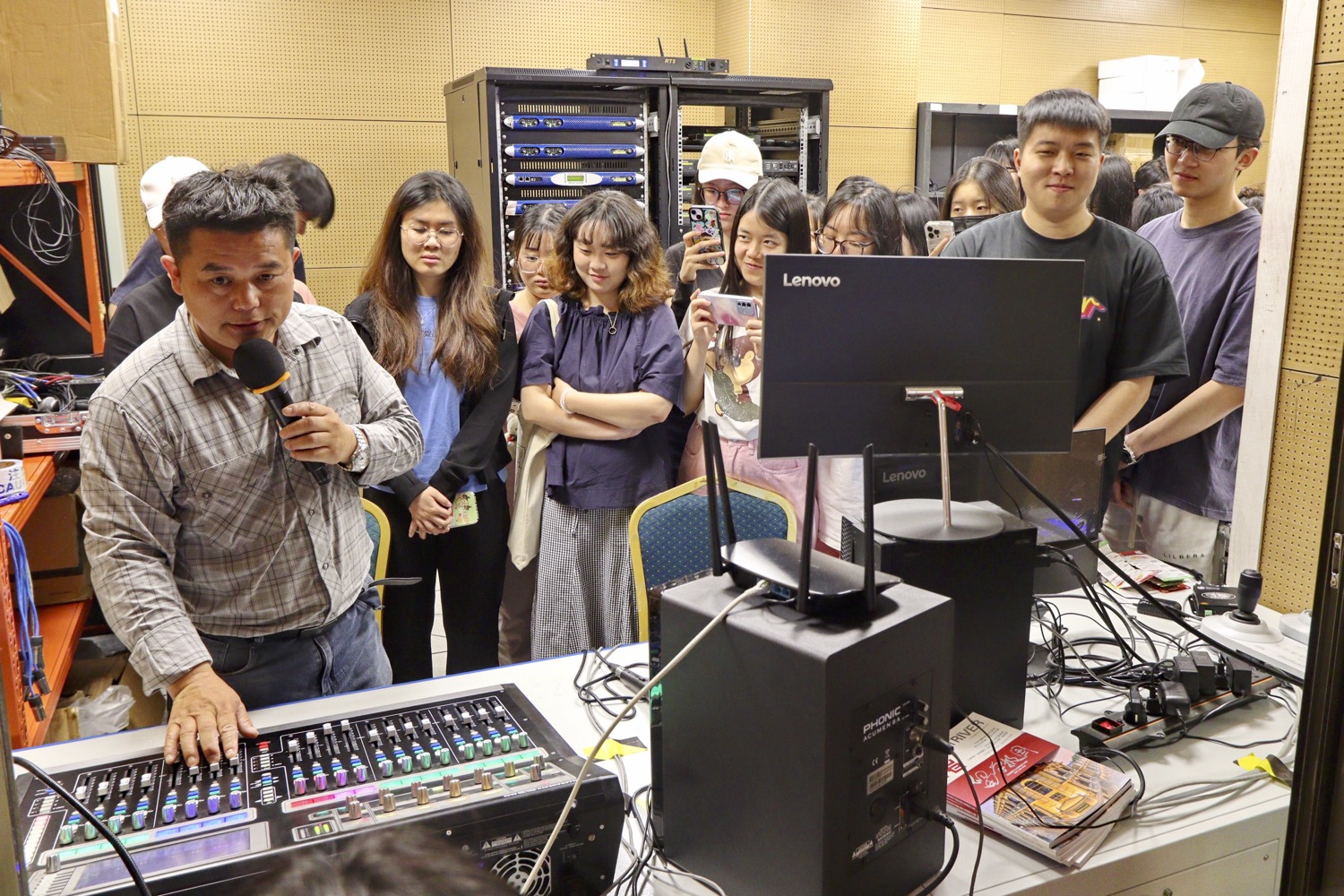 After the lecture, Mr. WU demonstrated the operation techniques of the lighting console and sound mixing console in the control room. Students could visualize different lighting effects on stage. They also had the opportunity to operate the audio-visual equipment, deepening their understanding of how audiovisual elements impact the audience's experience of performers on stage.