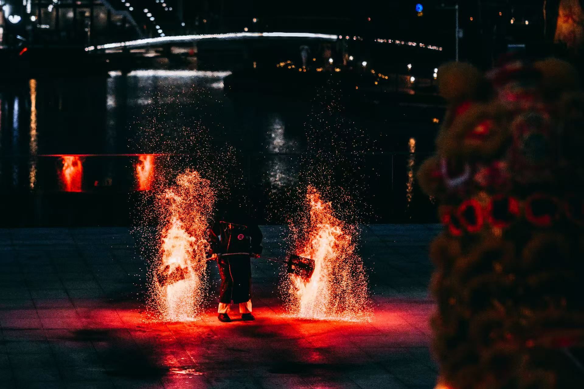 Guests, led by the dragons and lions, proceeded to the Boshui platform to enjoy the performances of luminous dragons and lions as well as the intangible cultural heritage (ICH) fire art. As night fell, the entire open area was suddenly illuminated by the golden and red sparks bursting forth. Immediately after, the fluorescent dragon and lion dances took the stage, where light and shadow intertwined, and colorful lights dazzled brilliantly.
