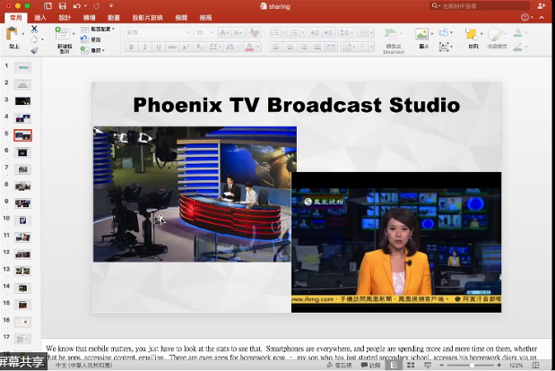 她谈到了电影与电视的区别,介绍了凤凰卫视,包括它的录制现场与画面设计与控制室中的人员安排情况,以及遇到突发新闻的应对措施。