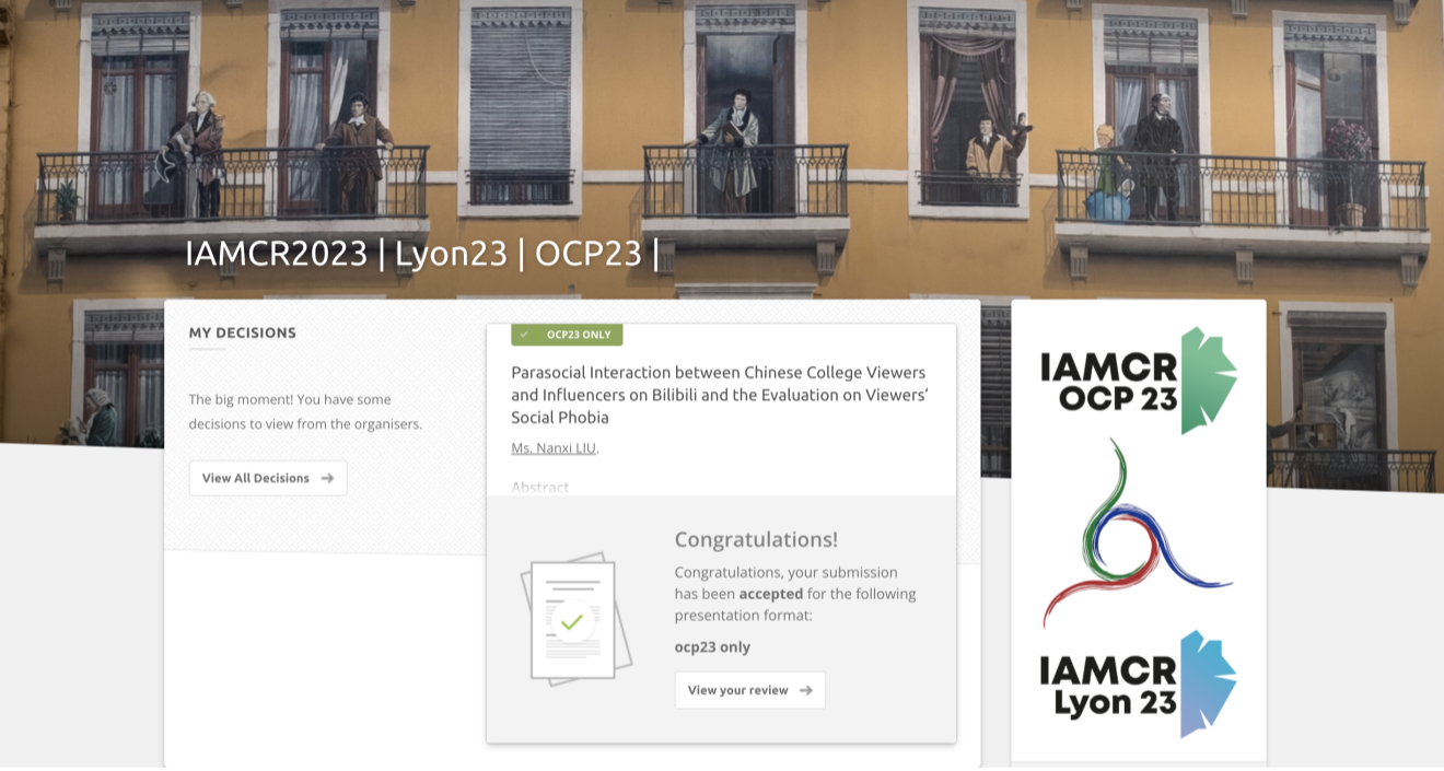 北师港浸大(UIC)2019级影视学专业的刘南希同学的毕业论文作品——“探究中国大学生与Bilibili平台Up主建立的准社会交往及此关系对观众的社恐程度影响”被国际媒介与传播研究学会(IAMCR)2023年会接受,参与线上分享。该论文作品由影视学专业助理教授樊斐博士指导。