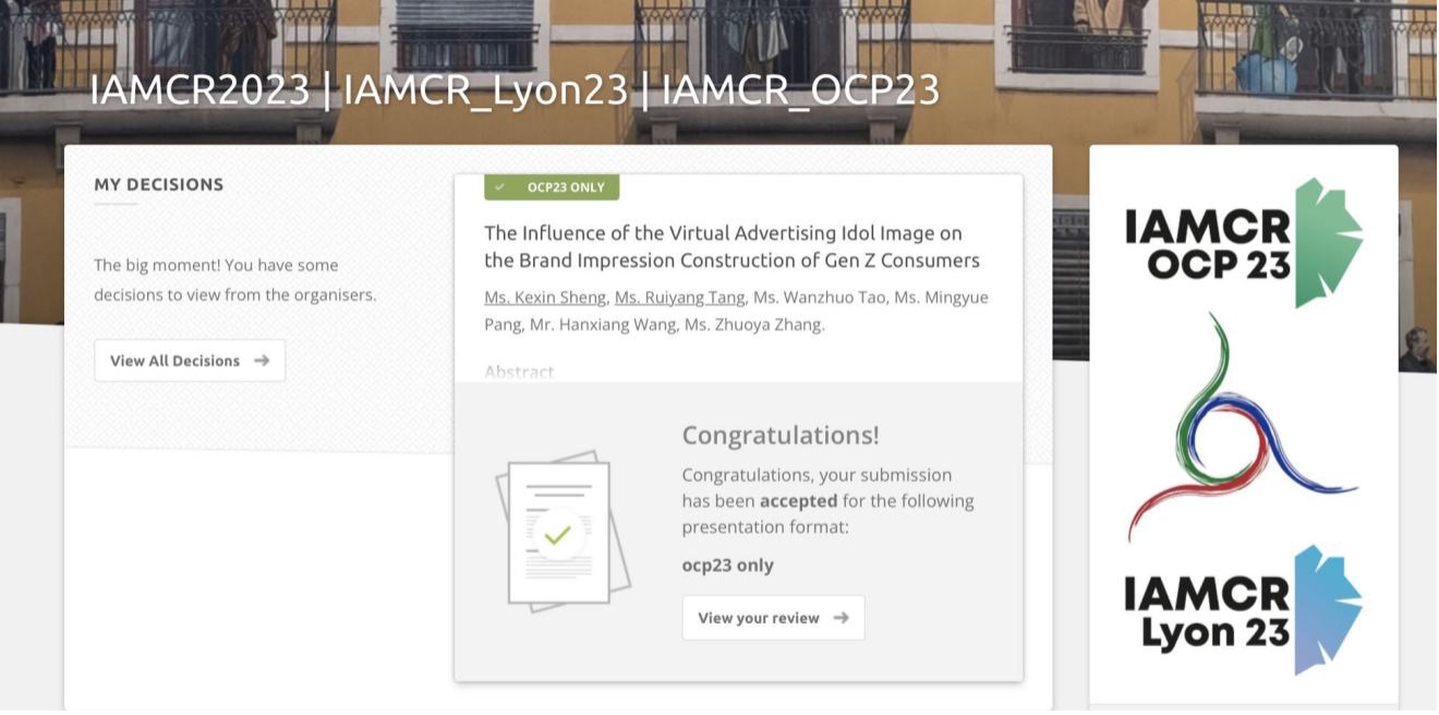 IAMCR由联合国教科文组织(UNESCO)主要发起和创办,是全球媒体与传播研究领域杰出的专业组织,旨在支持和发展全世界的媒体和传播研究。本次被学术年会接受的学术论文,旨在探讨新全球化的时代背景下科技与人类的交互碰撞,以“虚拟偶像代言人特征对Z世代消费者品牌印象构建的影响”为主题进行切入,来探究虚拟广告偶像的可爱度和专业度对年轻人的品牌印象构建是否存在影响、产生怎样的影响、又是如何产生影响的等等。本次学术研究采用量化研究方法进行数据收集和相关分析。研究发现,增强虚拟广告偶像的可爱性和专业性,有望提升Z世代消费者对品牌的印象。除此之外,该研究不仅对虚拟偶像的特征和相关技术有了更进一步的了解,还对Z世代年轻人消费者群体的行为表现和他们对品牌的印象构建有了更清晰的认知。该研究也探讨了当今企业使用虚拟偶像代言品牌的局限性,并给出相关建议进行对未来的展望。