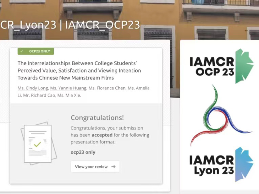 北师港浸大(UIC)2020级影视学专业的龙彦如、李静宜、陈静涵、黄晓嫣、曹永正、解雅涵同学的小组论文作品—“The Interrelationships Between College Students’ Perceived Value, Satisfaction and Viewing Intention Towards Chinese New Mainstream Films”被国际媒介与传播研究学会(IAMCR)2023年会接受。该论文作品由影视学专业助理教授樊斐博士指导。