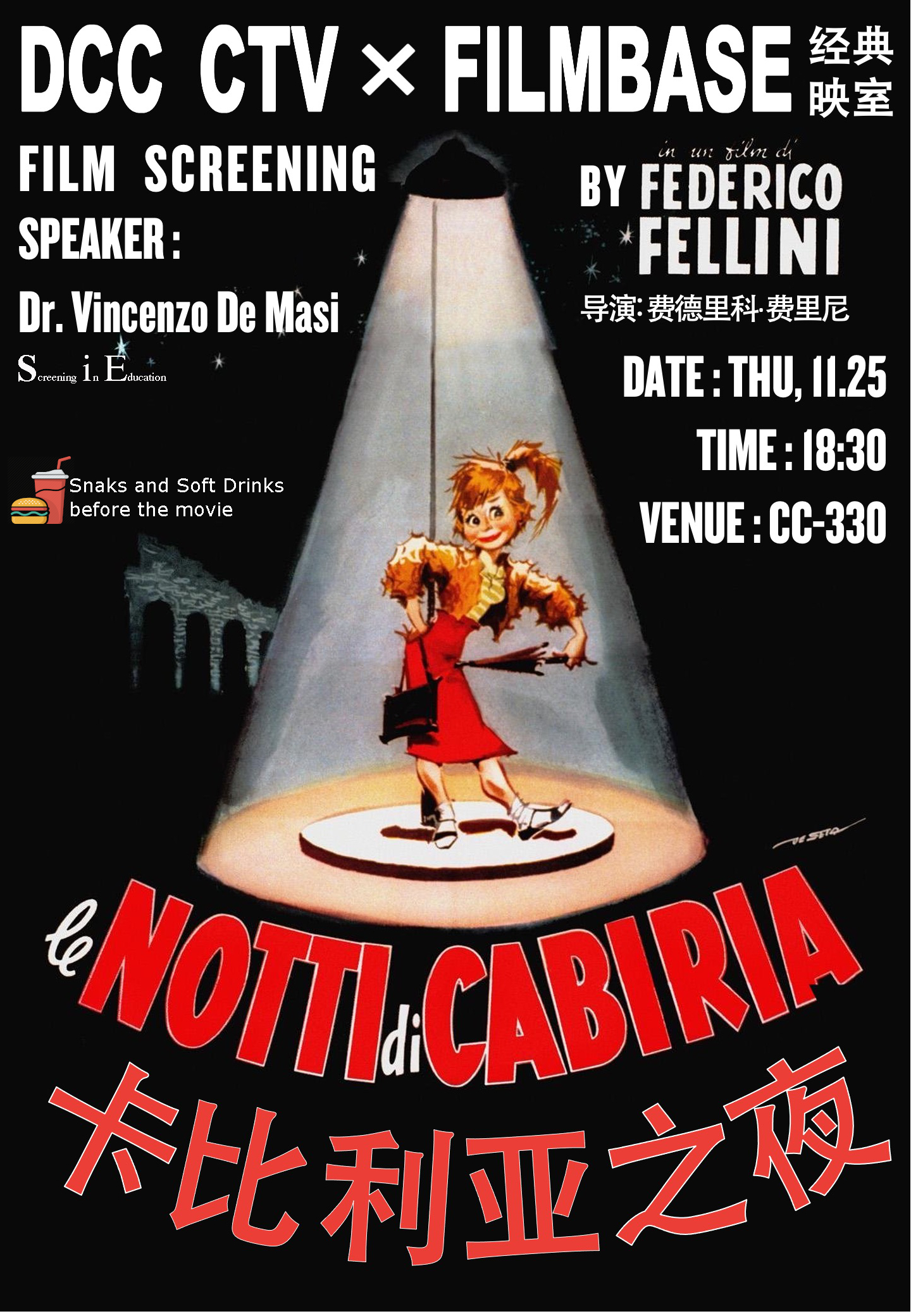 Cabiria is a young nocturnal entertainer who has achieved a certain economic well-being with her unfortunate profession. She is endowed with a fervent imagination and, despite the life she leads of her, of whose unworthiness she is aware, she has kept in the depths of her soul a treasure of naive goodness and incurable optimism. However, these two qualities of her expose her to painful disappointments.