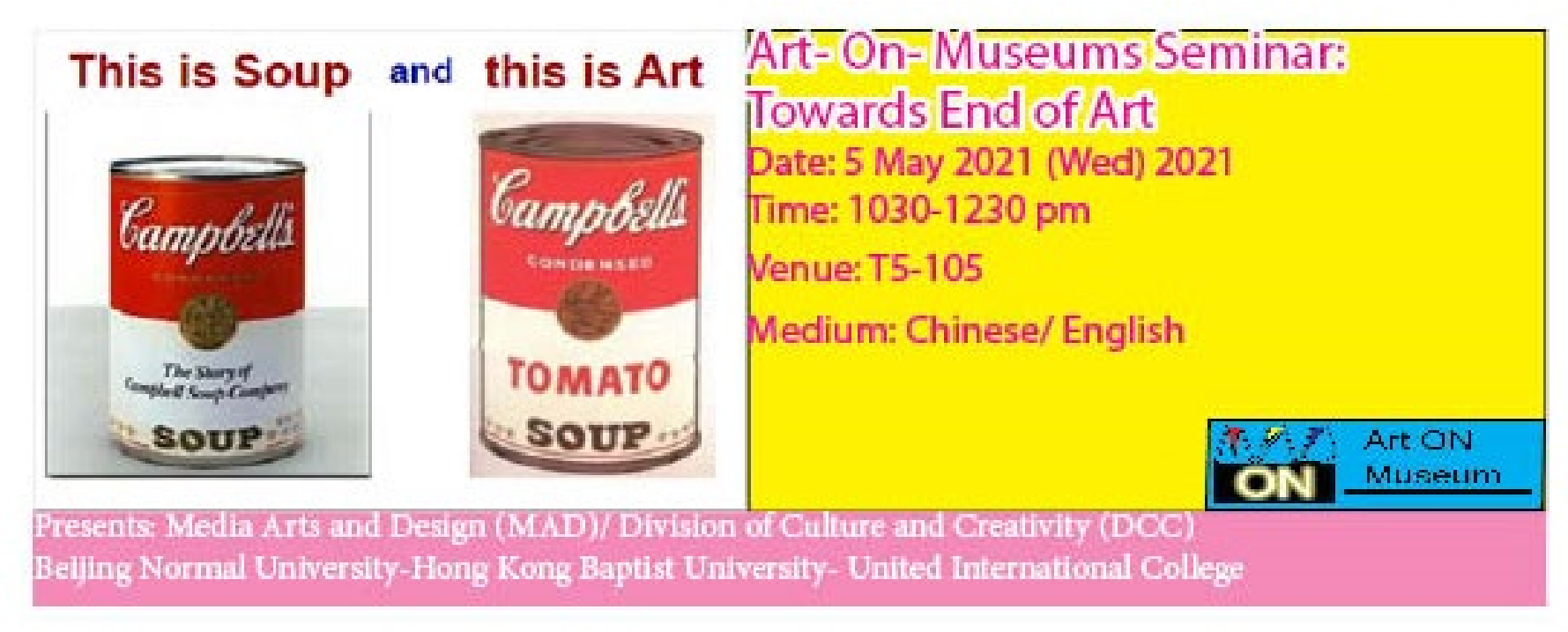 "Art- On- Museums Seminar" was completed and organized by Division of Culture and Creativity (DCC) on 5 May 2021. The seminar aims to exchange up-to-date discourse and museum practices in the field of contemporary art, especially focusing on the art geography from Alternative-Well Established-New-Branded museums. "ON" seems to be a common word in most contemporary art literacy such as Lucian Freud's Thoughts "ON" Painting (1954), Sol Lewitt's Paragraphs "ON" Conceptual Art Susan Sontag's "ON" Photography (1977), Damien Hirst's "ON" the Way to Work (2001), Walter de Maria's "ON" the Importance of Natural Disasters (2018), etc. Indeed contemporary art now is "ON" Crisis that Gillick and Charlesworth critically comment on their thought Is this the End of Contemporary Art as We Know It? (ArtReview, 2020).