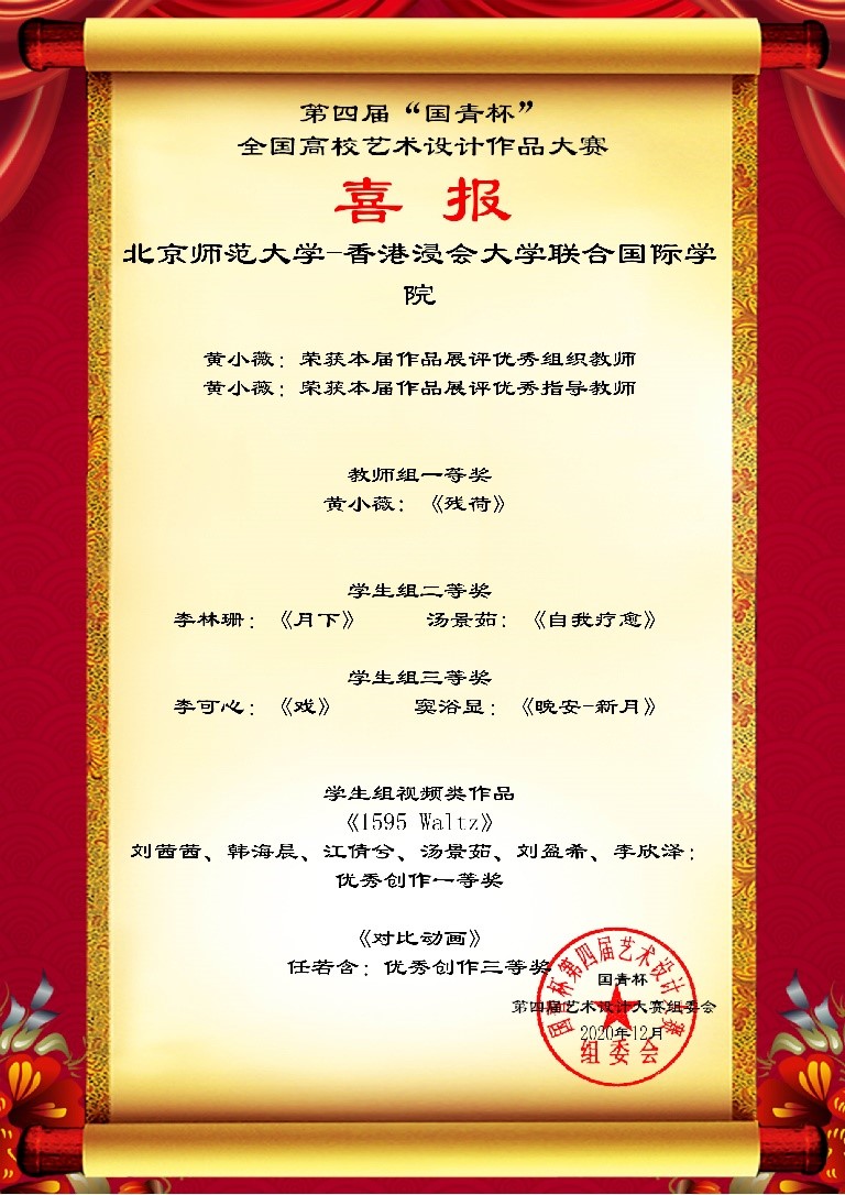 The competition was divided into teacher group and student group, MAD teaching staff Dr. Janey HUANG was awarded the First Prize in Photography, and was also awarded the honor of "Excellent Advisor" and "Excellent Organization Teacher". MAD student Li Linshan and Tang Jingru were awarded the Second Prize for Illustration and Mixed Media Production. MAD student Li Kexin and Dou Yuxian were awarded the Third Prize for Illustration. MAD student Liu Xixi, Han Haichen, Jiang Qianxi, Tang Jingru, Liu Yingxi, Li Xinze were awarded the First Prize of Outstanding Creation for Video Production. MAD student Ren Ruohan was awarded the Third Prize for Animation.
