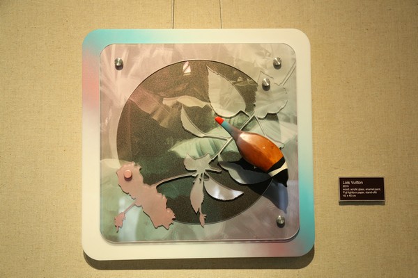Though titled Louis Vuitton, an artwork seemed to have nothing to do with luxurious goods. It contained a wood carving bird standing on a branch that was made of acrylic glass. The bird overlooked the tree and leaves in the background which was enamel paint.