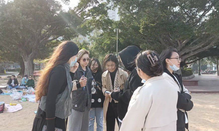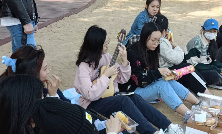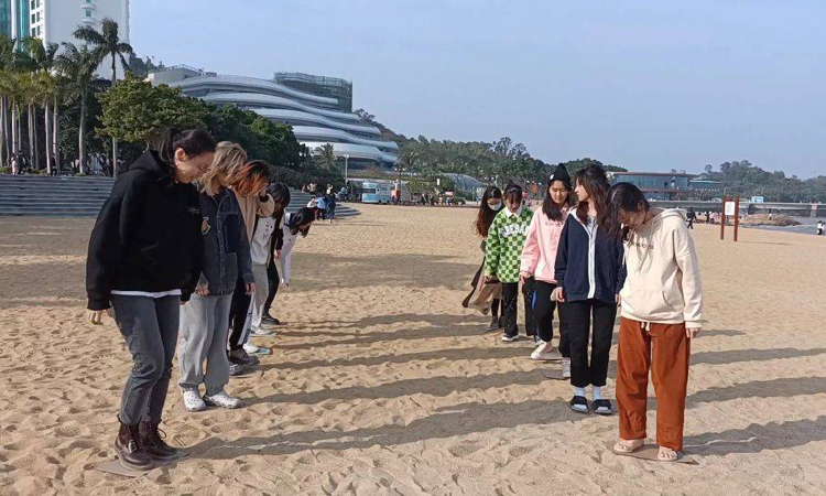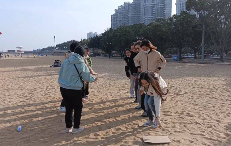 Students sat on the beach and introduced themselves. Some students gave performances and got applause from the audiences.