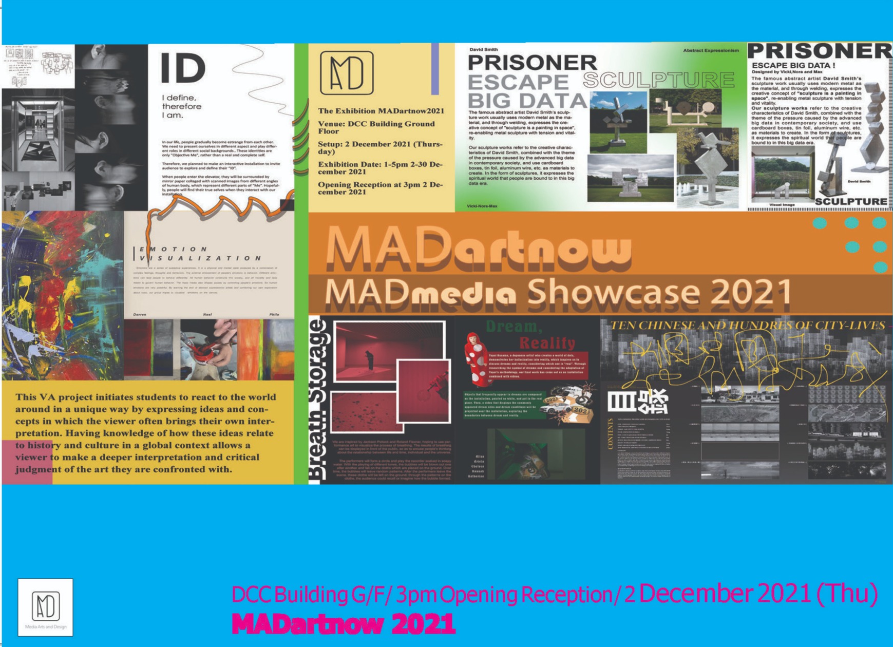The "MADartnow 2021" course exhibition opened at the DCC Building Ground Floor on December 2, 2021. The month-long exhibition presents six groups of works by Media Art and Design students from the course Visual Arts Since 1900. The course covers most key theories, philosophical trends, political and social changes that have shaped the development of Modern, Post-Modern, and Contemporary Art, such as: Constructivism, Cubism, Dada, Der Blaue Reiter and so on.