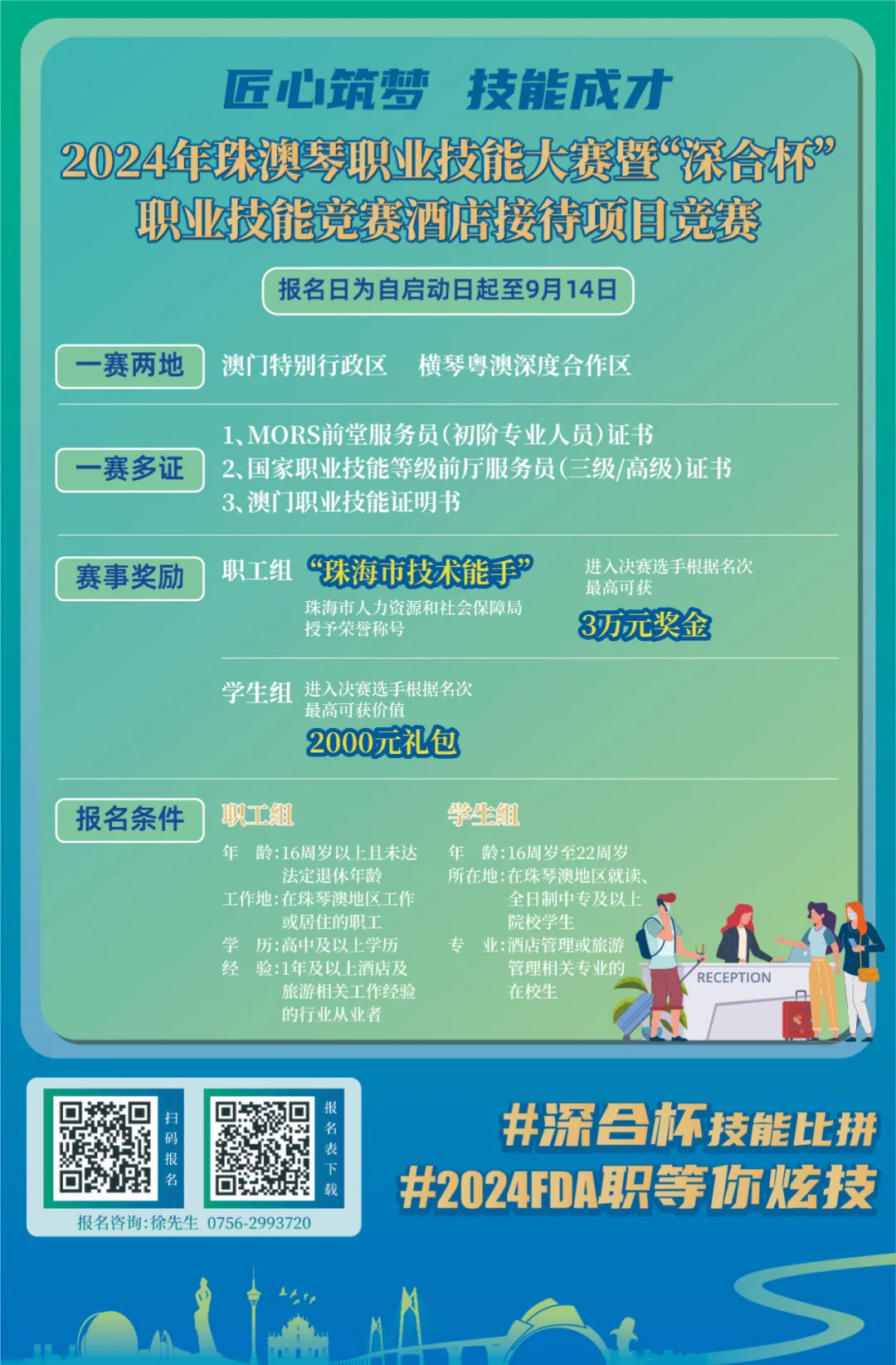 Hosted jointly by relevant units in Zhuhai, Macao, and Hengqin, this competition is a regional event vigorously promoted by the three governments. The competition stages include a new media presentation in the preliminary round, a theoretical examination in the semifinals, and an on-site demonstration in the finals. In the preliminary round, Lefeng CHEN created a three-minute hospitality scenario video in Chinese, effectively demonstrating his professional skills such as etiquette, demeanor, and oral communication, as well as his familiarity with the local hotel and cultural tourism scene. In the semifinals, he is set to tackle the challenge of a written theoretical examination.
