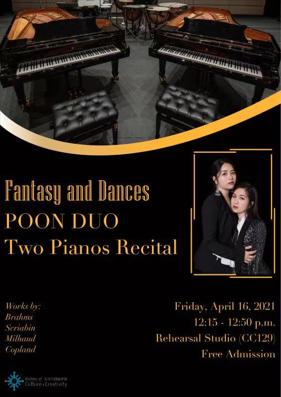 Young Steinway Artist Sandra Poon (Music faculty at UIC) and her sister May Poon formed the POON DUO in 2012, which is the only two pianos ensemble in Macau. They received their Master degrees at the University of Cincinnati College-Conservatory of Music and Indiana University Jacobs School of Music respectively. The duo was the recipient of the Special Prize at the Kayabuki Ongakudo International Competition, First Prize in Brussels International Music Competition, First Prize at the Ohio MTA/Graves Piano Competition, Agnes Fowler Scholarship, Macao Postgraduate Scholarship. Poon Duo has performed in the major cities of North America and Asia, and appeared in festivals and concert series such as Macao International Music Festival and Hong Kong Musica del Cuore. Their live recordings have broadcasted at the China Central Radio & Television General Station and Radio Television Hong Kong. In 2019, they gave a Macau-premiere concert of two pianos two percussion.