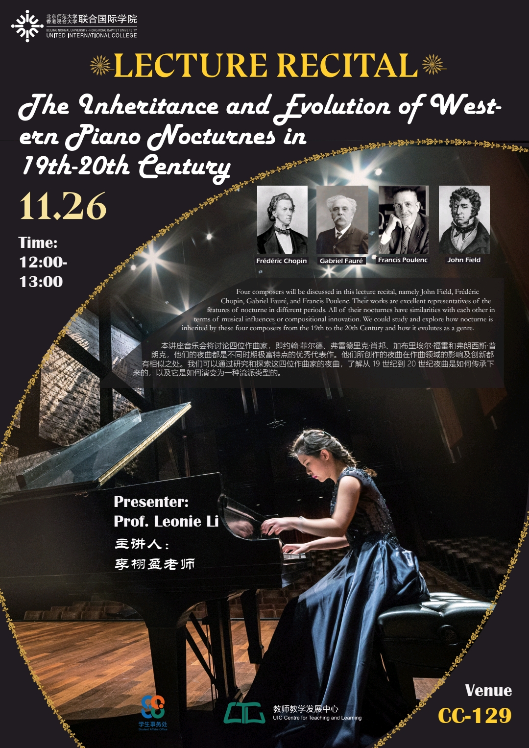 Abstract: As one of the characteristic genres with unique artistic charm in western music history, nocturne originated in the form of vocal works in medieval religious rites. After inheritance and development of time, the Irish composer John Field composed the first piano solo nocturne in 1812 as a pioneer, then opened up the field of nocturne composition as an independent piano instrumental genre, and later profoundly influenced the creation and development on the other fields and other genres. Four composers will be discussed in this lecture recital, namely John Field, Frédéric Chopin, Gabriel Fauré, and Francis Poulenc. Their works are excellent representatives of the features of nocturne in different periods. All of their nocturnes have similarities with each other in terms of musical influences or compositional innovation. We could study and explore how nocturne is inherited by these four composers from the 19th to the 20th Century and how it evolutes as a genre.