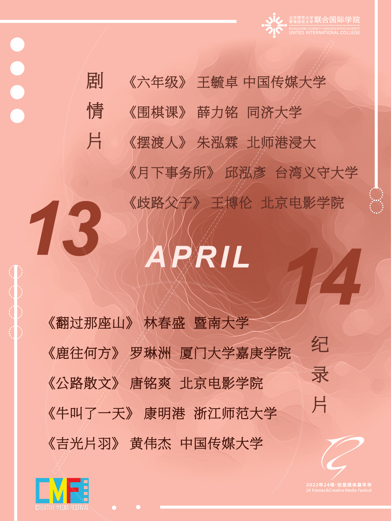 No. of Participants: 150 Brief introduction: "24 Frame & Creative Media Festival" will hold a screening of the competition with the Unit Title "ENTHUSIASM." Five non-fiction films and five fiction films were selected by the organizing committee, CTV instructors, and juries with abundant film production experience. It is an excellent chance to share your views and communicate with the filmmakers from other schools. What's more, We sincerely invite you to participate and vote for the two audience rewards. Meanwhile, we will webcast the whole screening activities via Bilibili (UID: 2064183376). Please find more details about this screening activity, including the screening list of the nominated films.