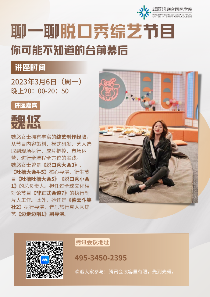 2023年3月6日,魏悠女士受邀为UIC「影视与新媒体制片管理专修」的研究生同学们以及「影视学」选修电子媒体管理的同学们带来了一场有关如何制作脱口秀综艺节目的业界分享。