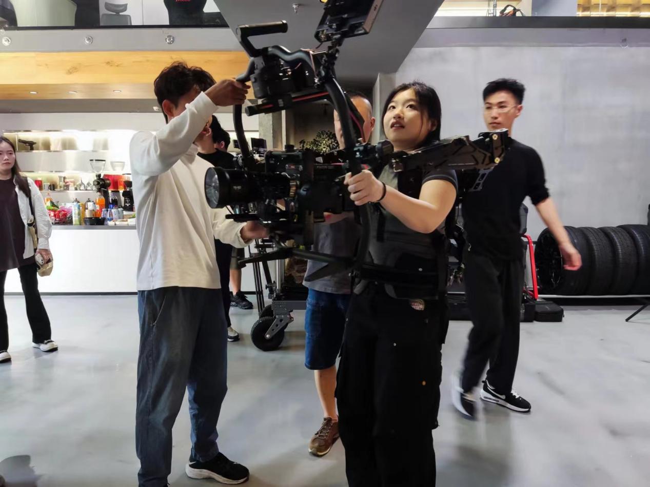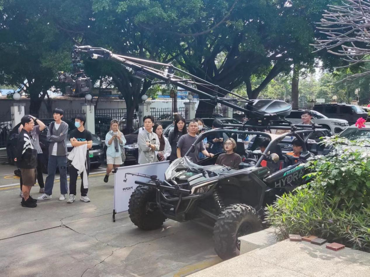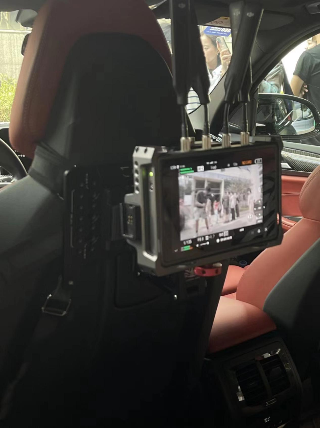 公司负责人还开车带同学们感受了车载减震拍摄、移动推车全套解决方案等,同学们也可以实时观看监视器并操控镜头的拍摄角度。