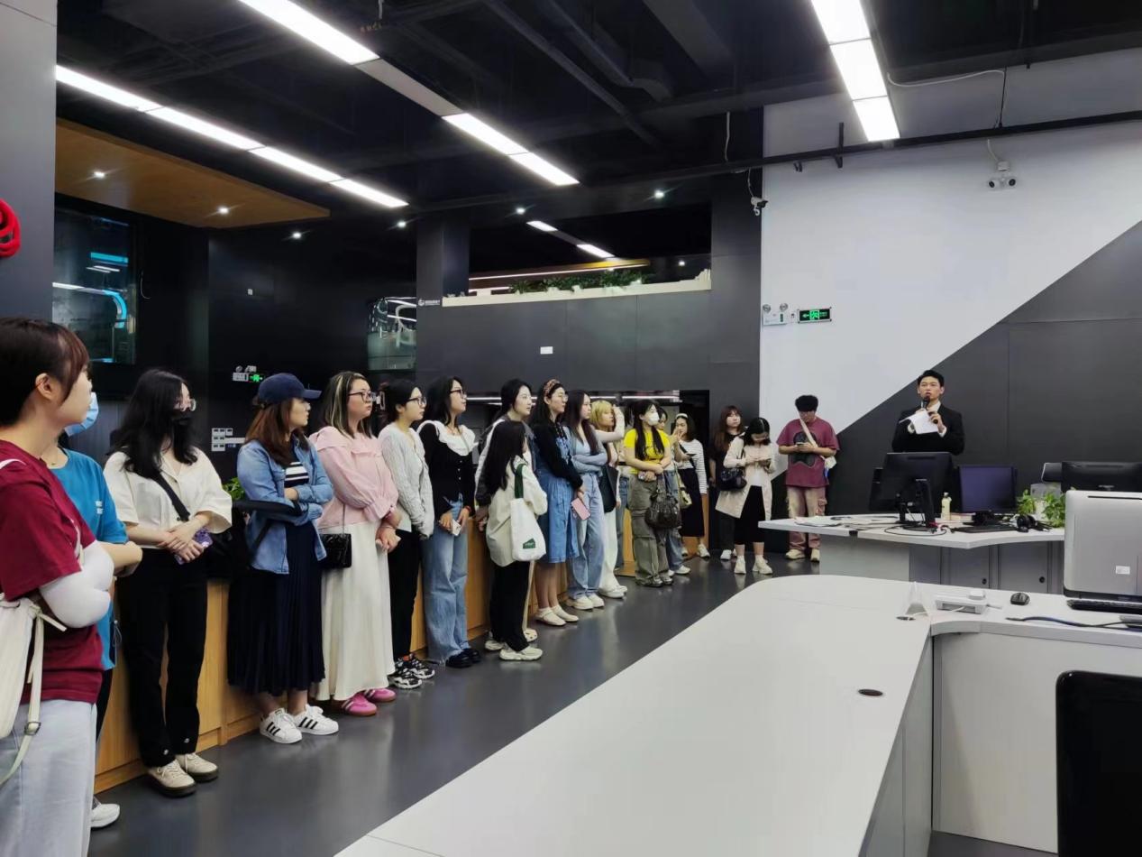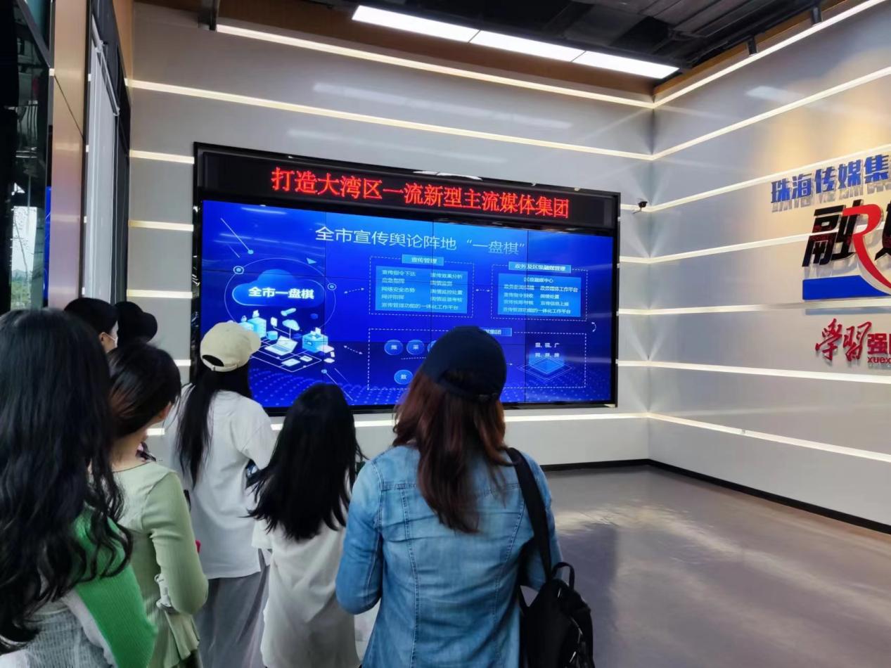 在主持人的带领下,同学们先通过短片对珠海传媒集团融媒体中心有了一定的了解,接下来又先后参观了“九霄”融媒体生态系统、演播厅以及导播室。
