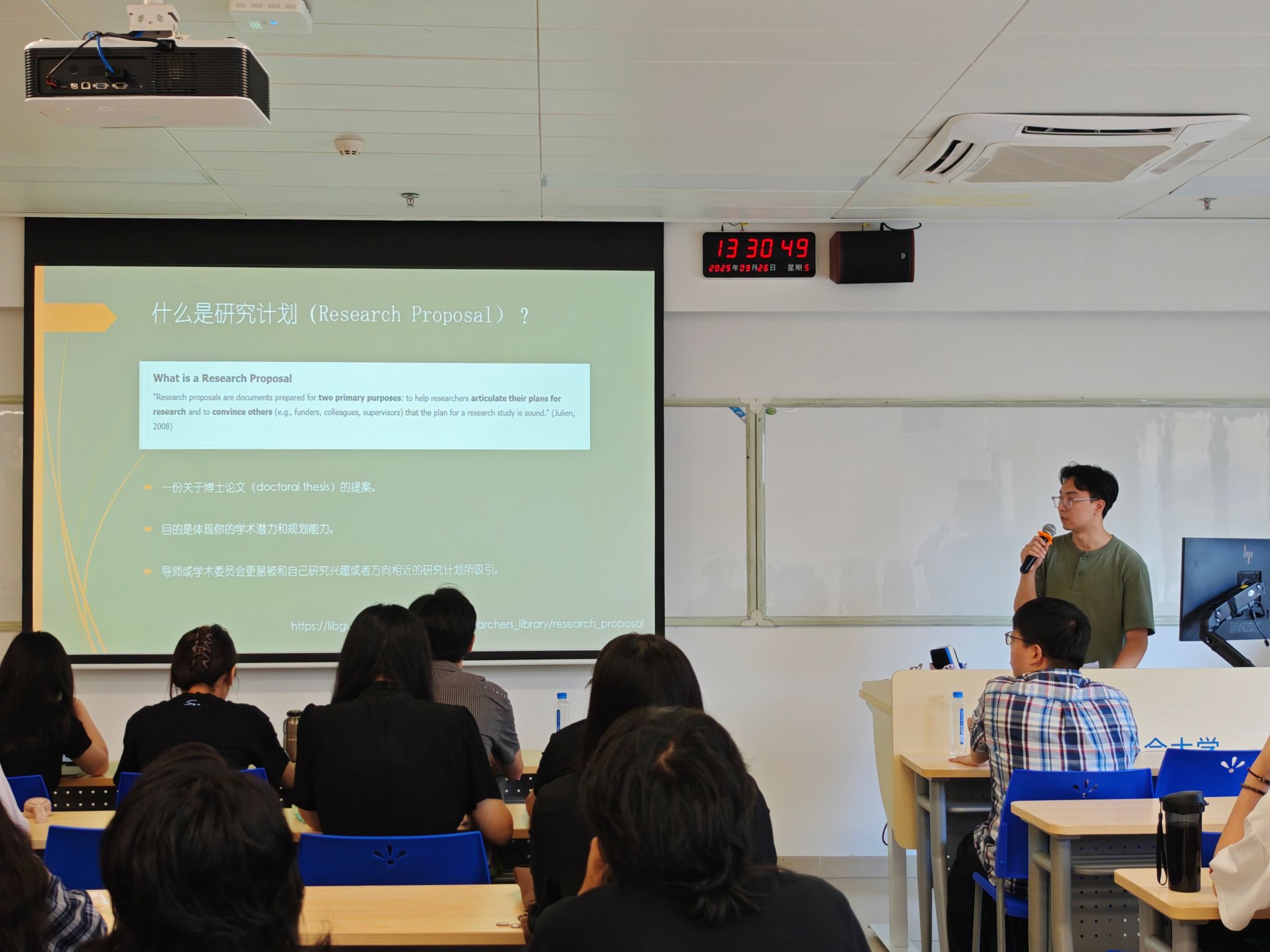 梁家俊学长则聚焦于研究课题的确定与研究计划的撰写。他从“研究方向”与“研究范围”两方面出发,引导同学们从兴趣、文献或既有研究中提炼出具有学术价值的课题。他还详细拆解了研究计划的每一个组成部分,从文献综述到理论框架,从方法论到章节规划,提醒同学们注意批判性思维的运用与时间规划,鼓励大家主动与目标导师沟通,争取反馈与指导。