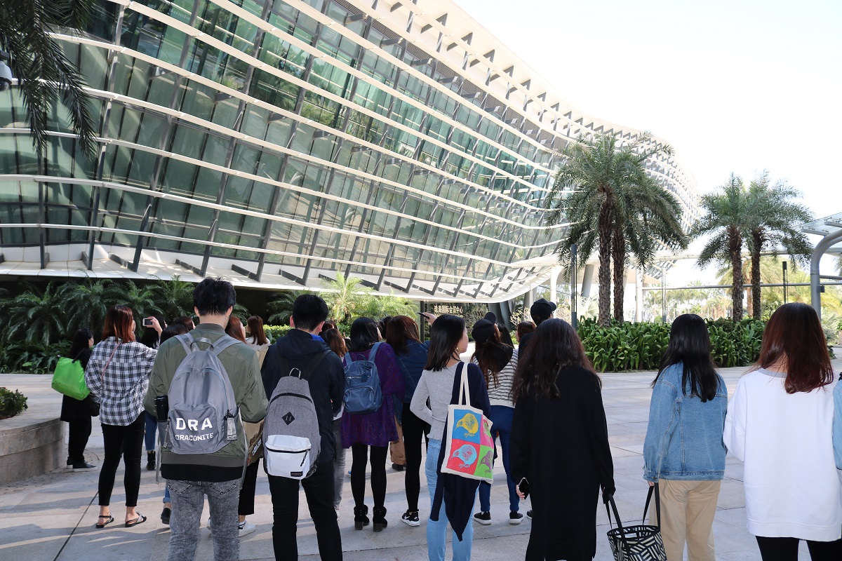 同学们在吴佩仪博士和助教罗卓的带领下参观珠海国际会展中心并集体合影留念