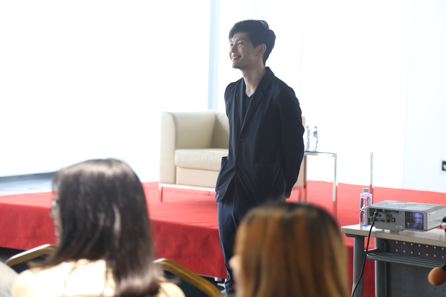 分享会于下午1时在CC-323展览厅举行,开始前的半小时,已经有同学提早占座。竹井先生到场时,看到座无虚席的会场,表示受宠若惊。分享会开始不久后,会场的人数超过了150人,原本空旷的大厅变得人山人海,竹井先生再次衷心向所有观众道谢。分享会中,竹井先生没有坐在台上的沙发椅上给大家侃侃而谈,而是站在了投影幕前,零距离跟师生面对面互动。