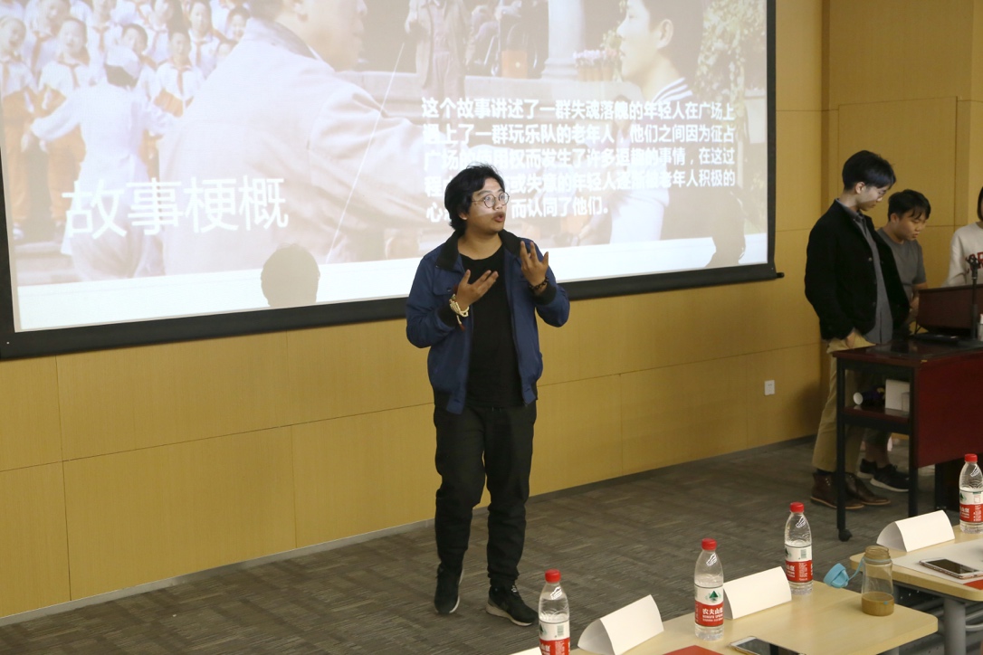 第三组是“北斋先生和他的蝈蝈们”团队,他们带来的故事《人民广场》,是关于一群失魂落魄的年轻人在广场上遇到了一群玩乐队的老年人,中间发生的许多逗趣的故事。探讨了青年人和老年人关于公共空间占用的议题,贴合了社会热点。这个团队全部由电影电视专业大四的同学组成,有着丰富的合作拍片经验,并获得过全国大学生广告大赛广东赛区一等奖。在完成介绍后,还播放了他们团队过往作品的剪辑视频,获得了评委老师的好评。