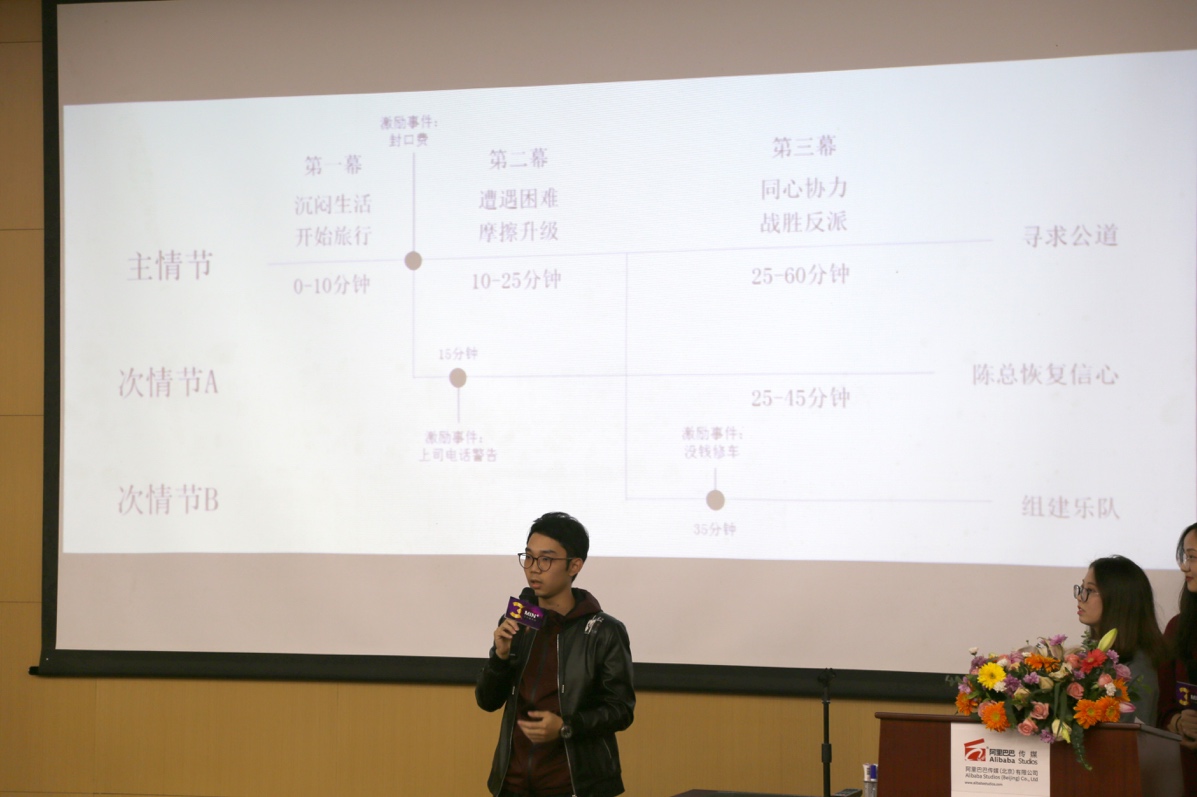 第二组是“怪兽先生团队”的作品《新长征路上》,故事讲述了处于瓶颈期的青年的追求和选择, 结合了公路类型和摇滚元素,团队对于情节设置和预算安排等方面做了详细的讲解。