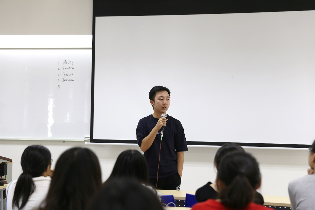 接下来,保雨楸同学向大家分享了她在凤凰卫视的实习经历,告诫大二的师弟妹们进入职场要从小事做起,慢慢才能接触到整个制作流程。另外,保雨楸同学曾到美国担任交换学生,她还向大二同学们传授了申请美国高校交换生的技巧。