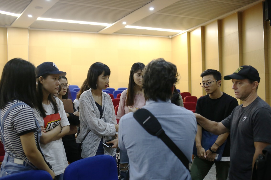 随后,Andrew老师分别就法律法规、用电安全、器材使用安全、打斗场面拍摄、枪械使用、玻璃制品使用、道具使用、烟雾火焰使用、交通、动物拍摄和未成年人拍摄法规等多个有可能出现安全隐患的方面结合丰富的案例和影片给同学们进行了安全知识的普及。他要求同学们必须时刻注意安全,把危害安全的系数降到最低的同时,能使作品呈现最大化的表现效果。