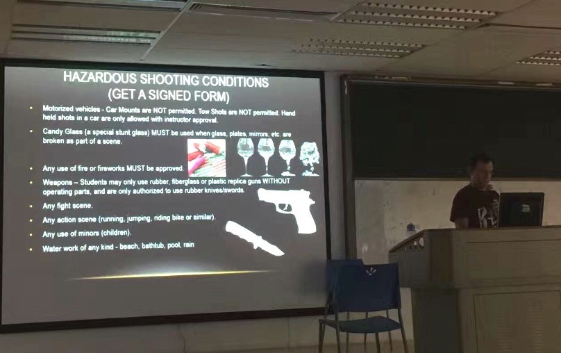 电影电视专业William Andrew助理教授首先播放了同学们在以往作品中涉及危险动作或安全隐患的镜头,并与同学们分析拍摄过程需注意的安全事项。