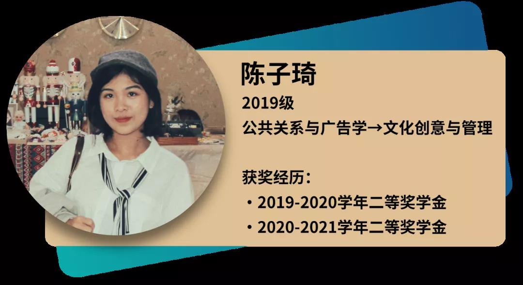 挑战自我,期待多元体验。 大一时,陈子琦由新闻传播大类专业分流后,发现没有特别适合她的专业,于是在大一下学期就开始为转专业的事情做准备,陈子琦做了思维导图分析自己的性格爱好,得出一些她感兴趣的专业和行业,在辗转各个老师的办公室了解这些专业的基本情况之后,列出了不同专业的优缺点,经过一番比较,陈子琦被文化创意与管理专业的课程设置吸引了,她了解到这个专业是文化艺术与商业管理的融合,课程内容包含了商业背景下的文化、媒体、设计和创意产业等。大二时,决定挑战自我的她转到了文化创意与管理专业。