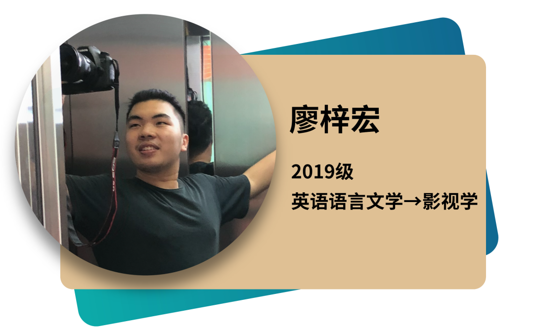 虽然英语语言文学专业的语言学导论、文学导论等课程对廖梓宏启发很大,但他心里一直有一个“电影梦”,于是,抱着"现在不学电影以后可能都没机会了"的心态,他顺利申请转到了在填报高考志愿时与自己擦肩而过的影视学专业。