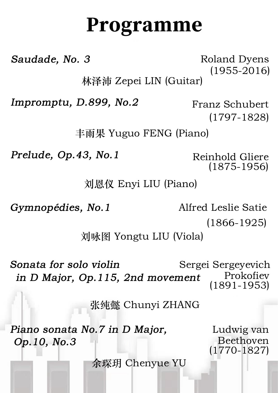 刘恩仪的前奏曲是由俄罗斯作曲家格里埃尔为钢琴所作,这首乐曲精心编排的和声布局体现了俄罗斯民族乐派的和声特点。调性的转换给音乐增添了绚丽的色彩,使音乐充满了新鲜感,此曲就是利用调性的转换来展开,复杂的和声材料做铺垫,加以该同学的演奏行云流水,将乐曲的巧妙之处演绎的淋漓尽致。