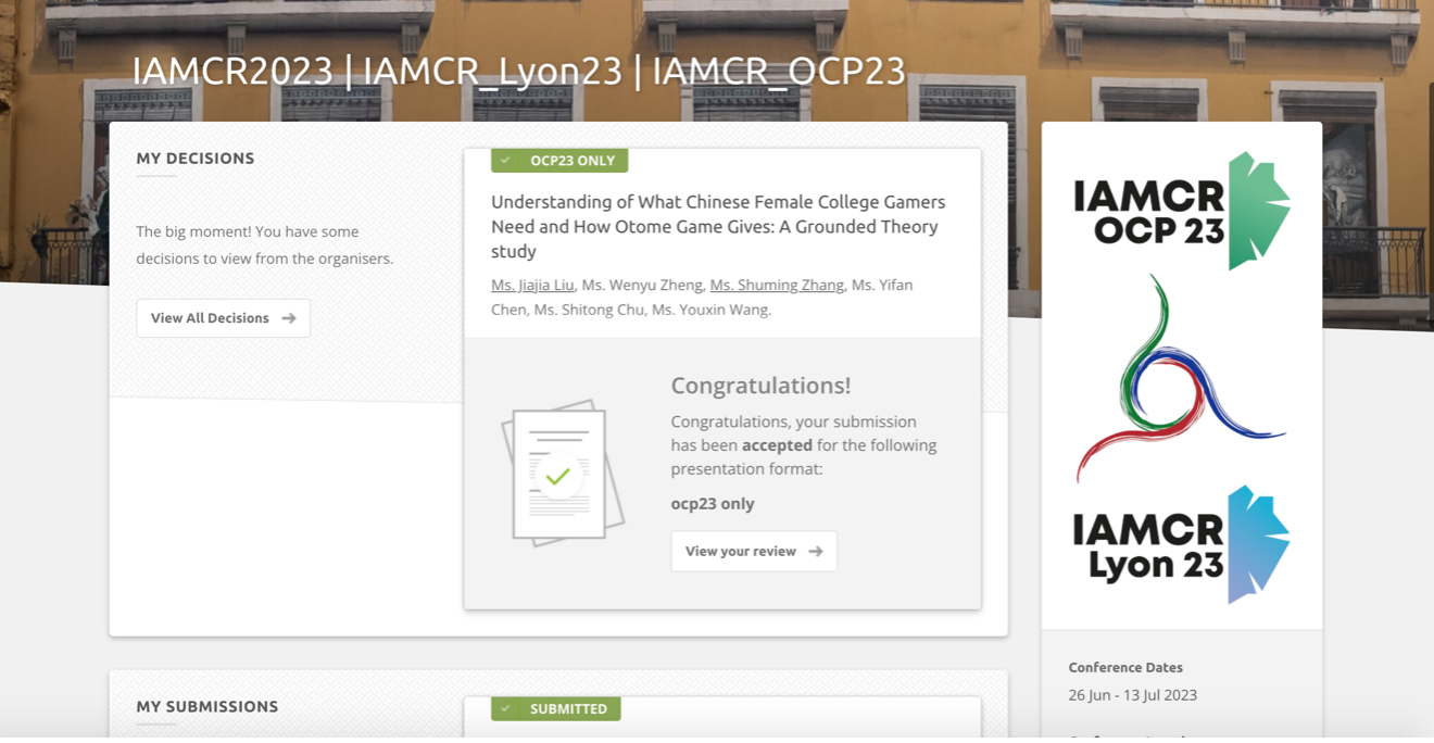 北师港浸大(UIC)2020级影视学专业的刘佳嘉、郑文雨、张书铭、陈依凡、储诗桐、王友欣同学的小组论文作品—“基于扎根理论理解乙女游戏如何满足中国大学女性游戏玩家的需求”被国际媒介与传播研究学会(IAMCR)2023年会接受。该论文作品由影视学专业助理教授樊斐博士指导。