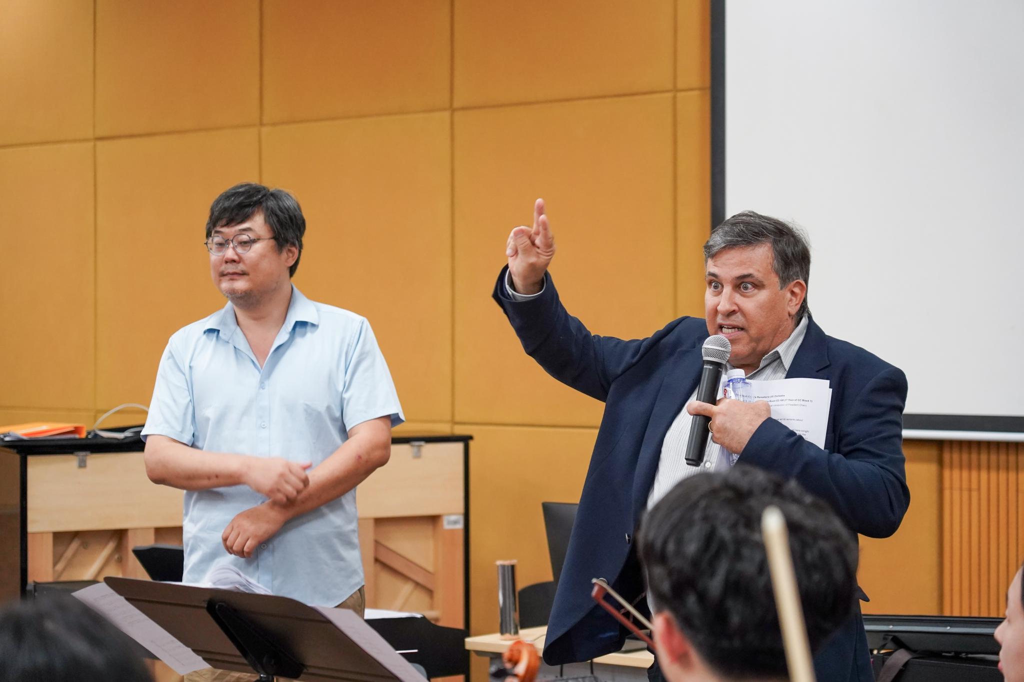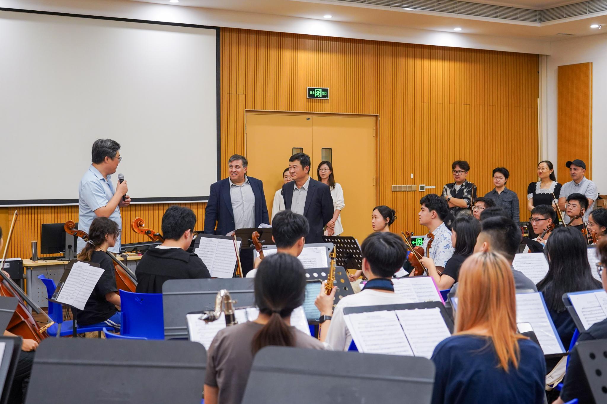 音乐系主任托马斯·亚历山大·斯坦教授以热情洋溢的开场辞为活动拉开序幕。他热烈欢迎陈校长的到来,并隆重介绍了为UIC管弦乐团发展作出卓越贡献的各位核心教师。斯坦教授同时分享了他对乐团的美好愿景,强调音乐系在培养学生音乐技巧与激发文化表达方面所做的不懈努力。他特别提到,UIC管弦乐团近年来不断成长,未来将拥有更多展现自我的机会与艺术成就。