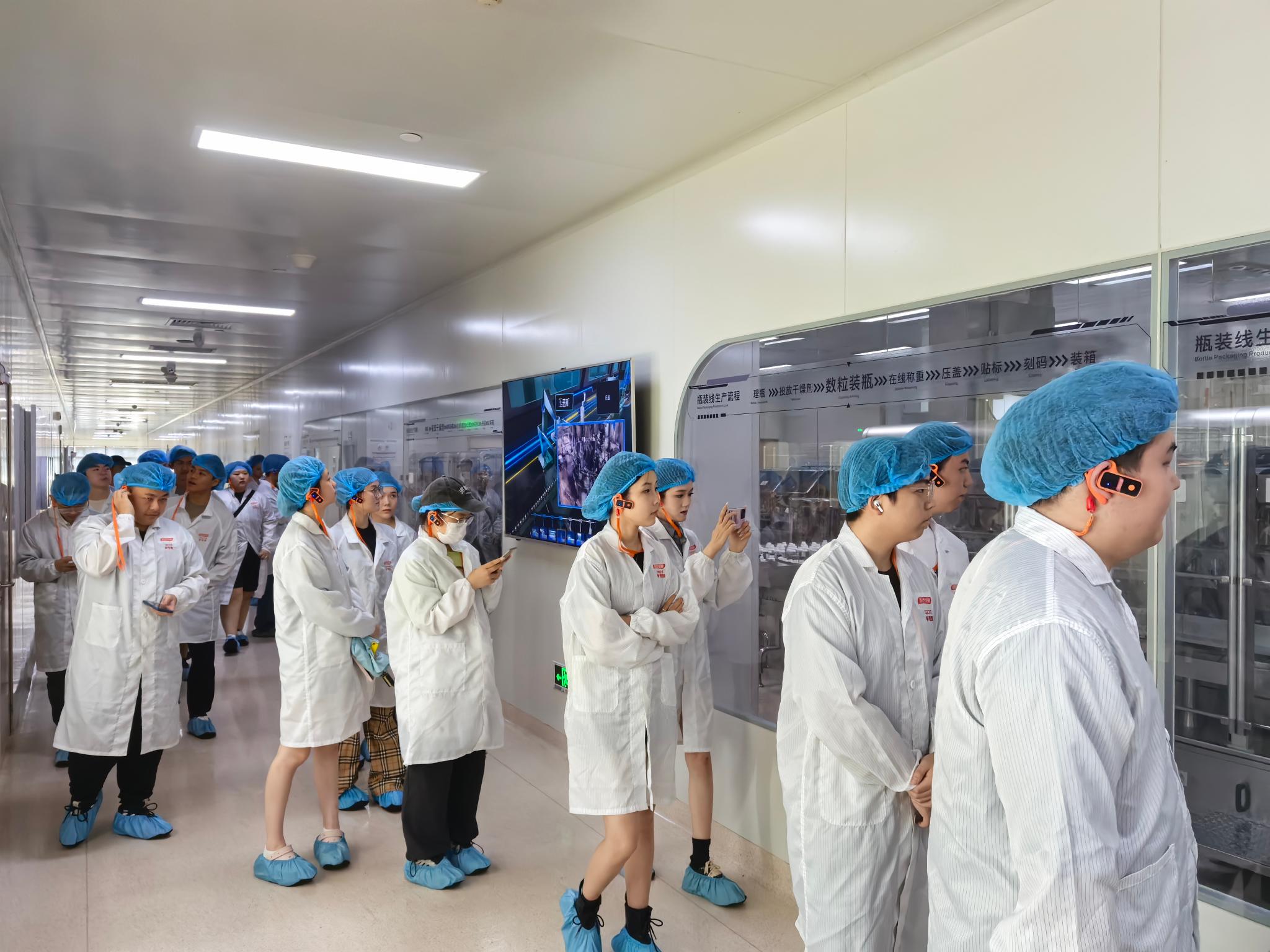 在透明工厂,学生们首先品尝了汤臣倍健的营养产品。随后在工作人员的指引下,他们换上无尘服,戴上头套和鞋套,深入到工厂内部参观。他们亲自见证了生产线的运作,对产品从原材料到成品的完整制造过程有了更多的了解。