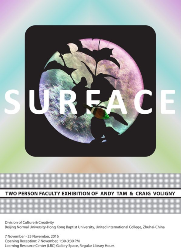 This Faculty Art Exhibition: Surface (see also Fig. 2) featured the creative work of Mr Craig Voligny and myself. Both the East and the West have long and complex histories in which painting has evolved in tandem. These artistic histories can be viewed as equal but different or overlapping and complimentary. Actually, both definitions can apply, the former more relevant to the far past, and the later definition more relevant to our contemporary globalized culture. Painters in the West have drawn inspiration from the East for at least 150 years, from Paul Gaugin to Brice Marden. The list is equally as long (or longer) amongst Asian artist influenced by the West. In this exhibition these ideas were once again explored and intermingled. Themes of scenography, consumerism and cultural ambiguity were also explored through the Surface of painting while making reference to both Eastern and Western art histories, from Dadaism to Classical Chinese Painting. It is also mutually explored and experimented in the aspects of Culture and Creativity via these Faculty Exhibition works. In this exhibition, I extended the thought-forms of scenography and the controversial statement that defined and redefined the new and cross-territory contexts of Western-Chinese painting.