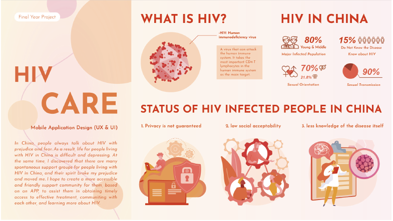 In China, people always talk about HIV with prejudice and fear. As a result, life for people living with HIV in China is diffcult and depressing. At the same time, I discovered that there are many spontaneous support groups for people living with HIV in China, and their spirit broke my prejudice and moved me. I hope to create a more accessible and friendly support community for them, based on an APP, to assist them in obtaining timely access to effective treatment, communiting with each other, and learning more about HIV.