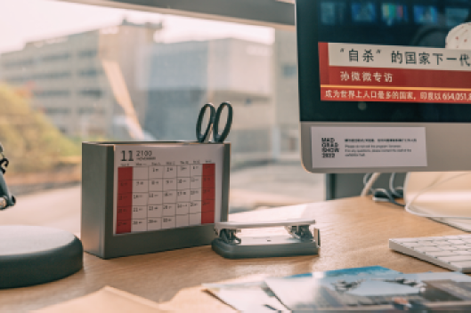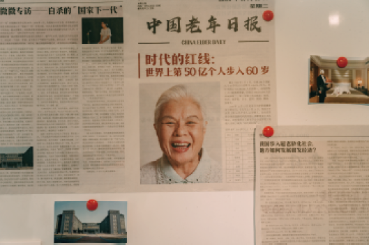 This multi-media installation project looks at the social problem of aging. The artist imagines a super-aged society may appear in the near future and presents speculations on possible social problems in the form of newspapers and news videos.