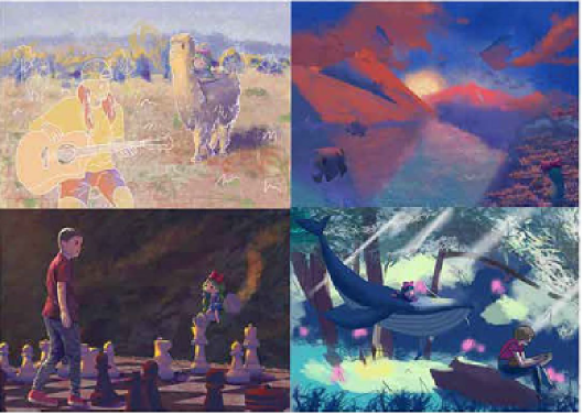 This is an adventure story about a little girl. She is a brave traveler She travelled to a fantasy world and met many animals and human friends. She saw fishes flying towards the sun, fell in love with an alpaca, used chess as her vehicle, danced with humans, read on the back of a whale, stood on a cello in a forest concert, and bravely stood at the highest point of an acrobatic show There are 8 illustrations in total.